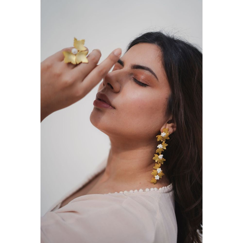 Petals, made in brass are carefully placed next to each other. Embellished with glass beads, this piece is perfect to play dress up.