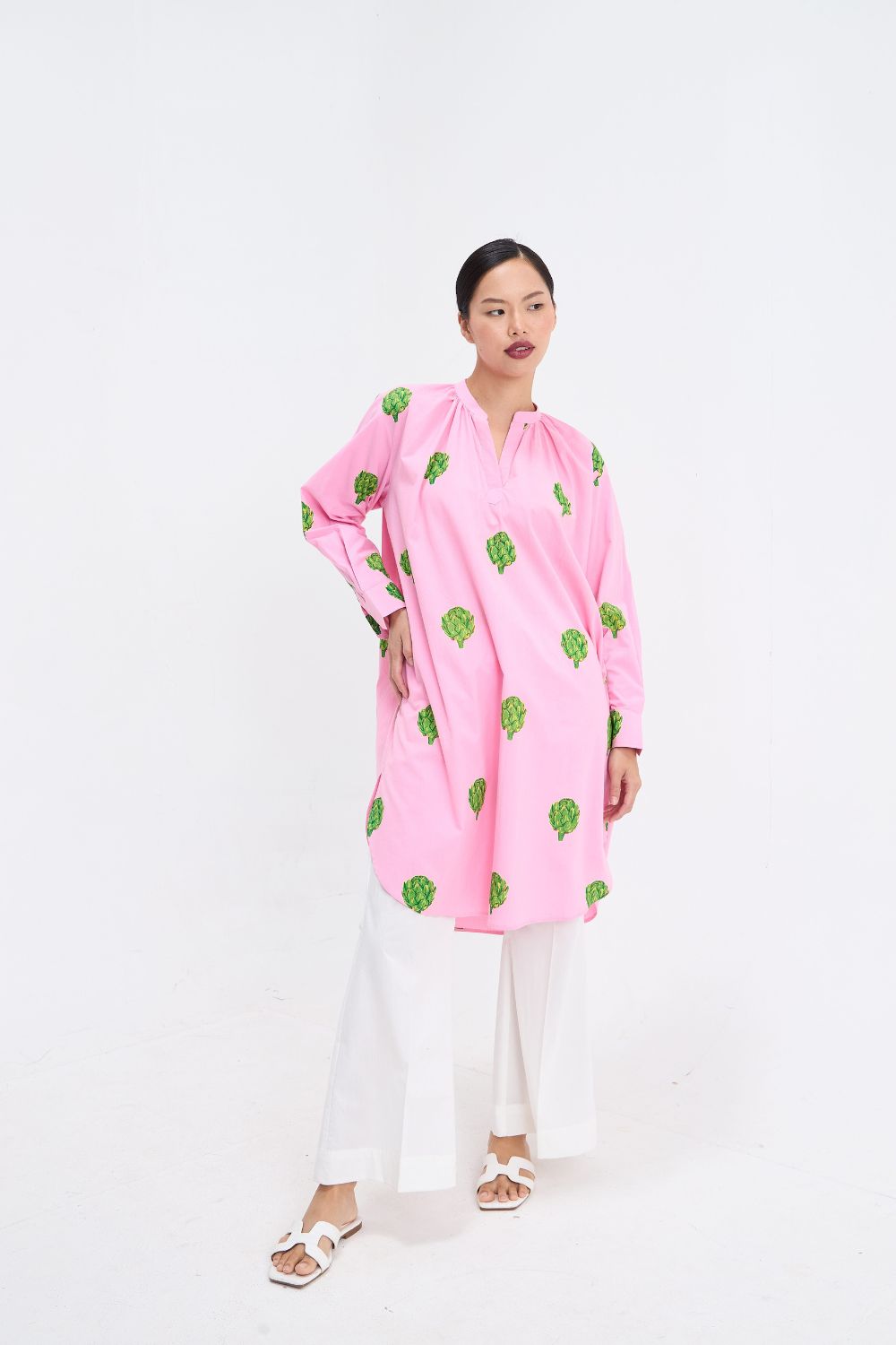 This charming kurta set features a playful artichoke screen print on a stunning pink base. The kurta, crafted from fine poplin fabric, offers a relaxed yet elegant fit, perfectly paired with