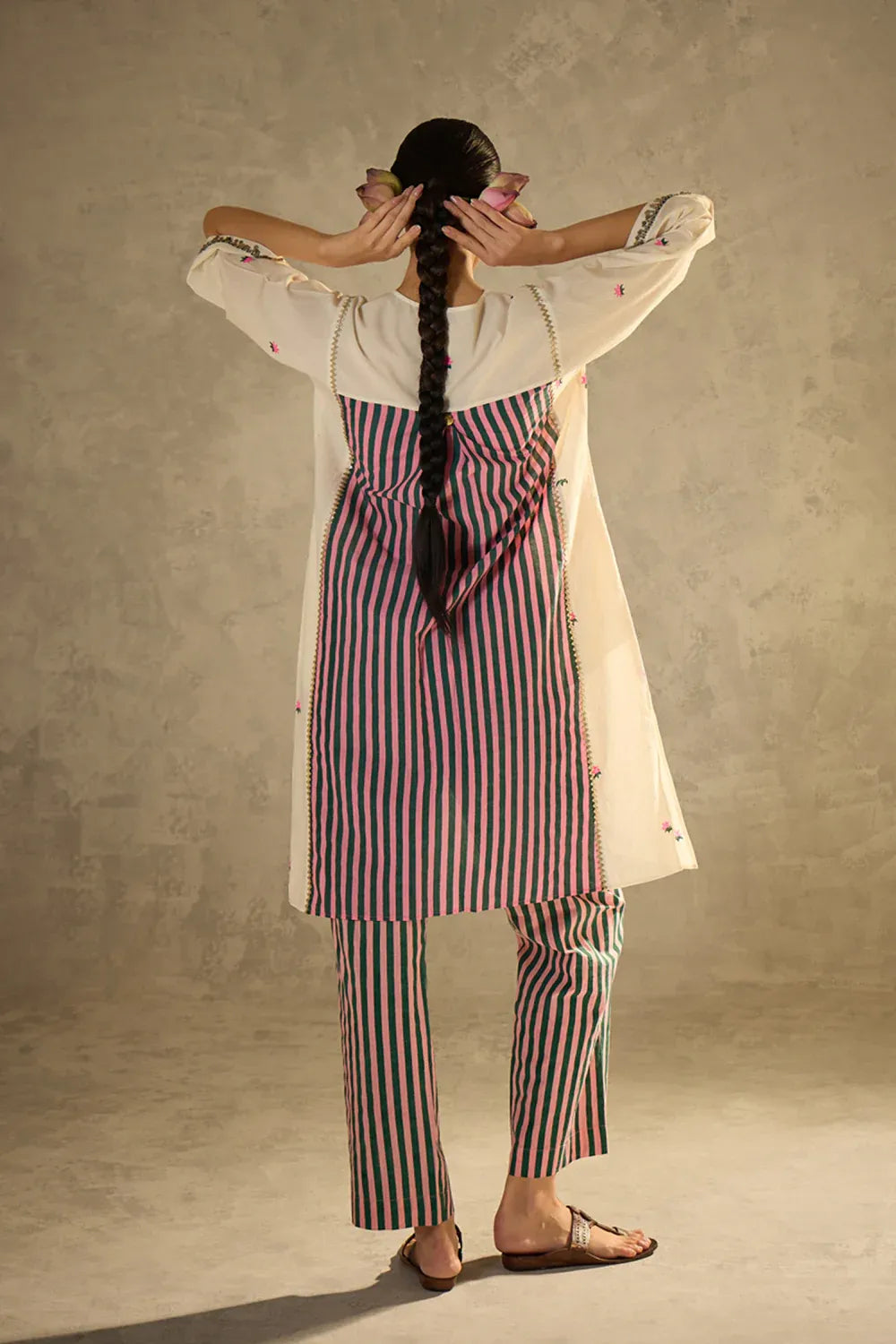 This kurta set features a delicate lotus block print with stripe detailing at the back and fine handwork on the sleeves. Paired with stripe block printed pants