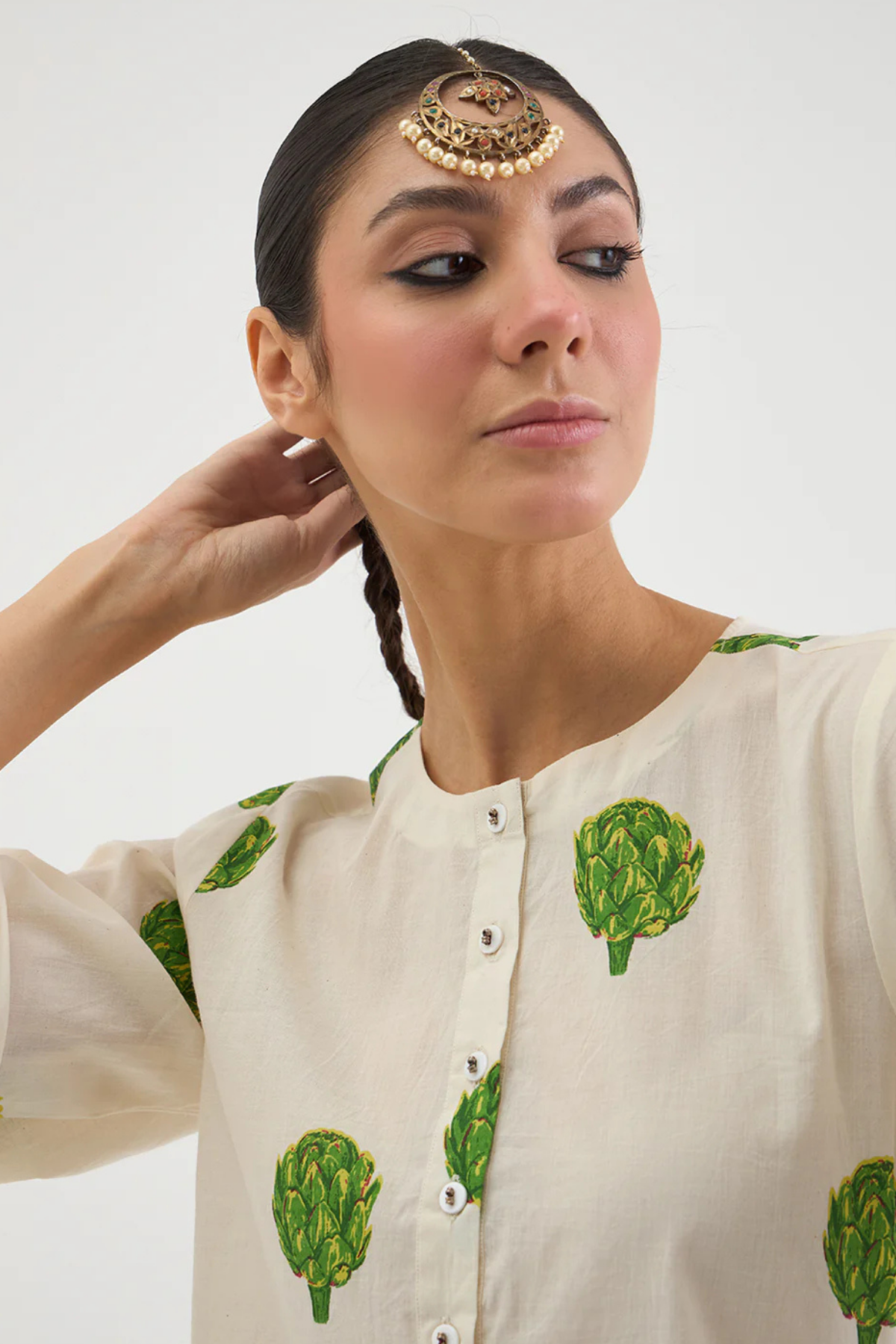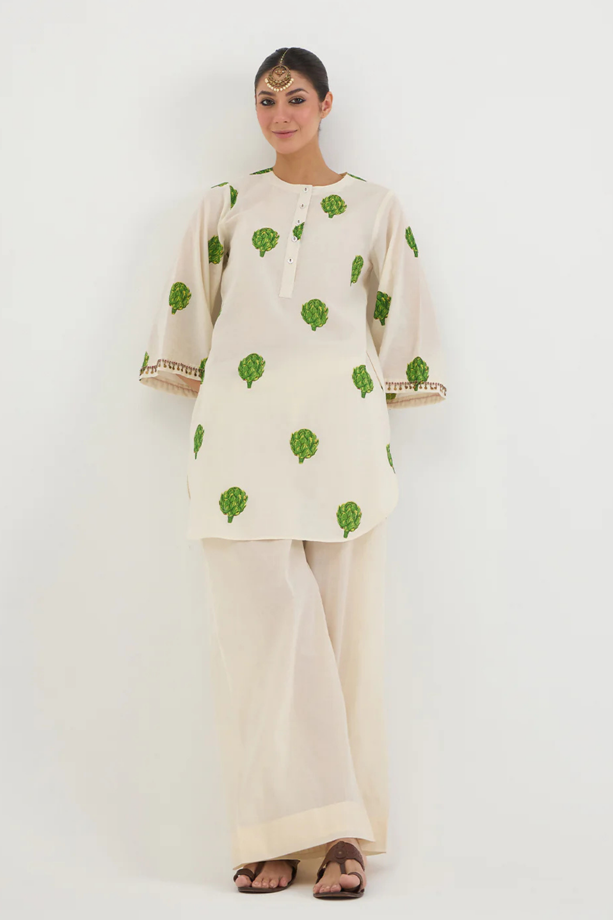 Classic kurta cut with round hem line and playful artichoke print, paired with off white wide bottoms.