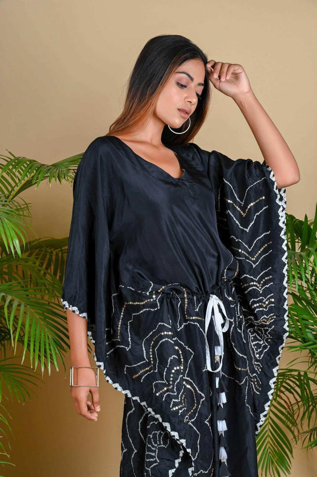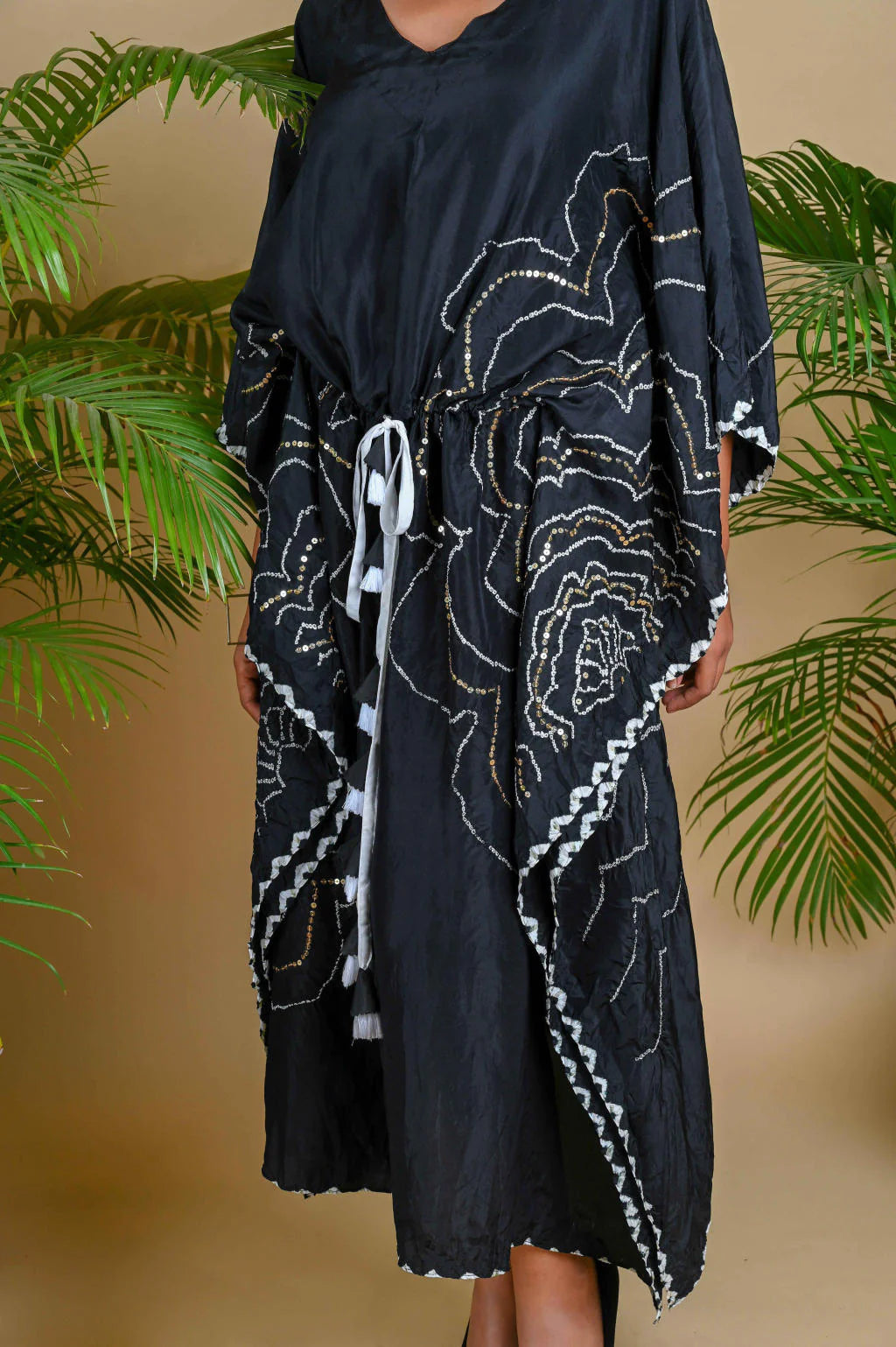 Bandhani flower motifs placed on either side of the kaftan are highlighted with sequence. The drawstring at the waist has handmade tassle and shell details.