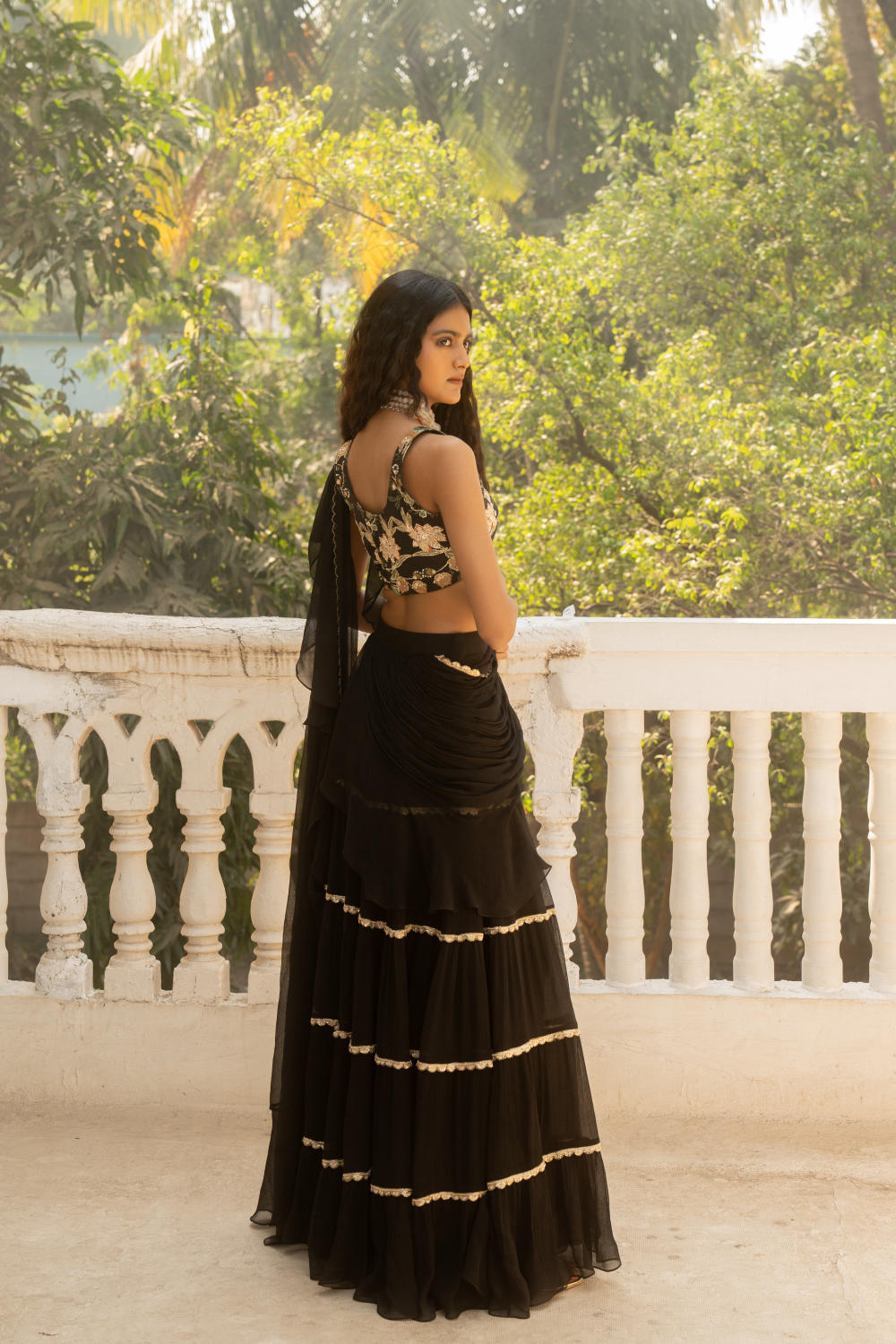 A black pre–stitched chiffon saree is crafted from pure chiffon and it is adorned with lace, paired with a print embroidered corset blouse.