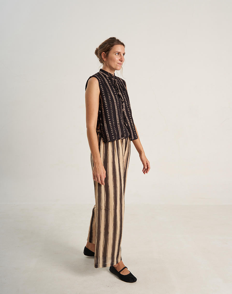 The Zebra Stroll Pants, part of our SS '24 Collection, are cut from breathable hand-woven cotton. These pants feature a classic black and white stripe design with straight legs and a high-waist cut, making them a classic addition to any wardrobe. Ideal for the summer season, these versatile pants can be effortlessly paired with a top or shirt and complemented with sandals to complete a relaxed look.