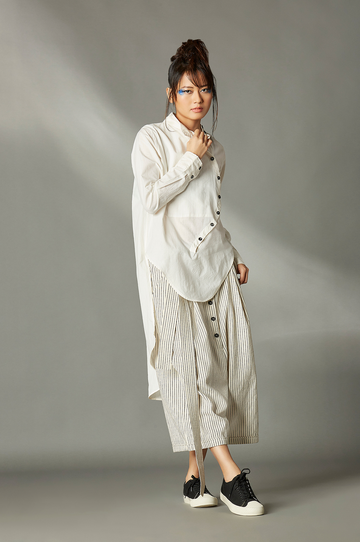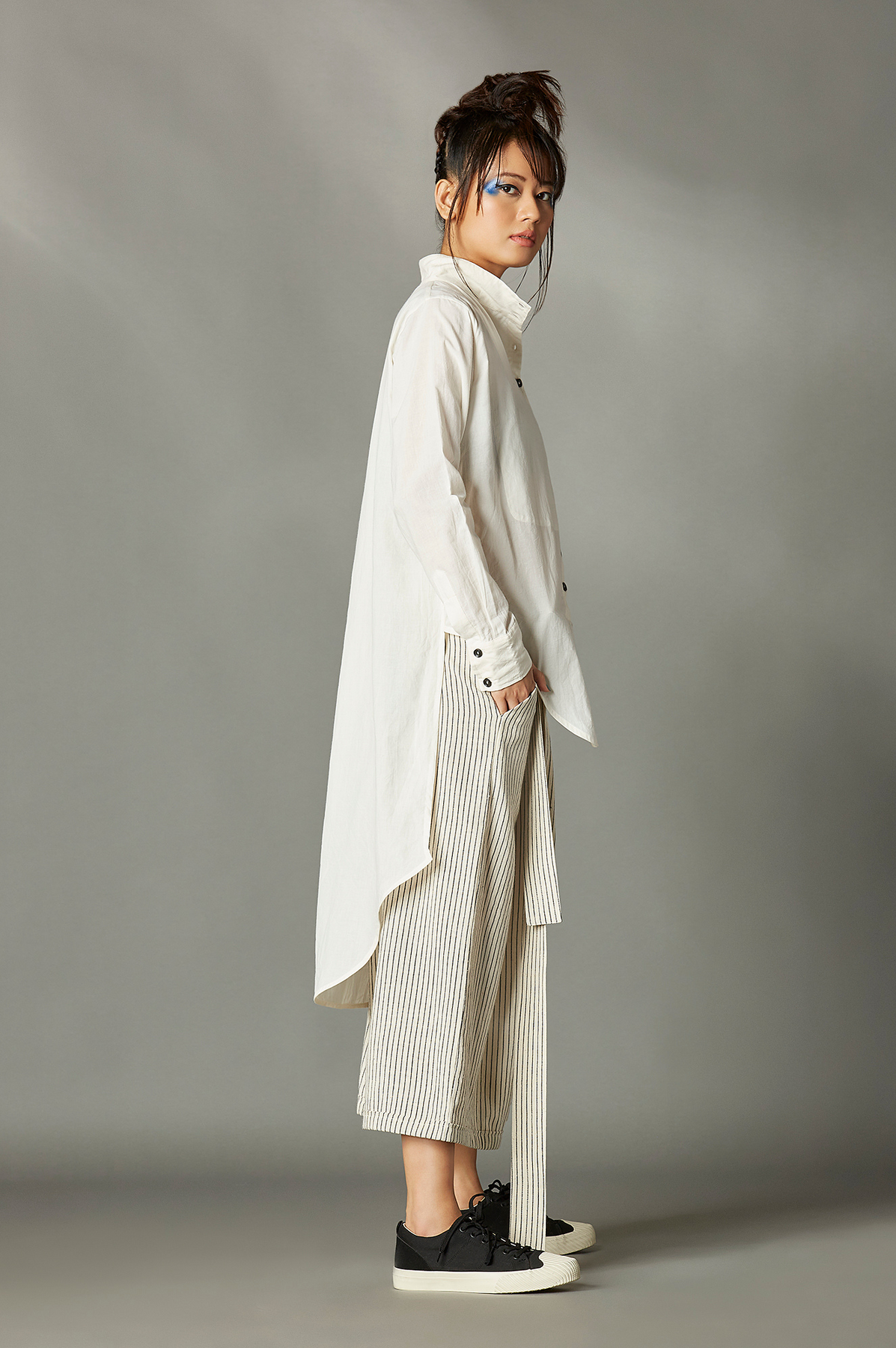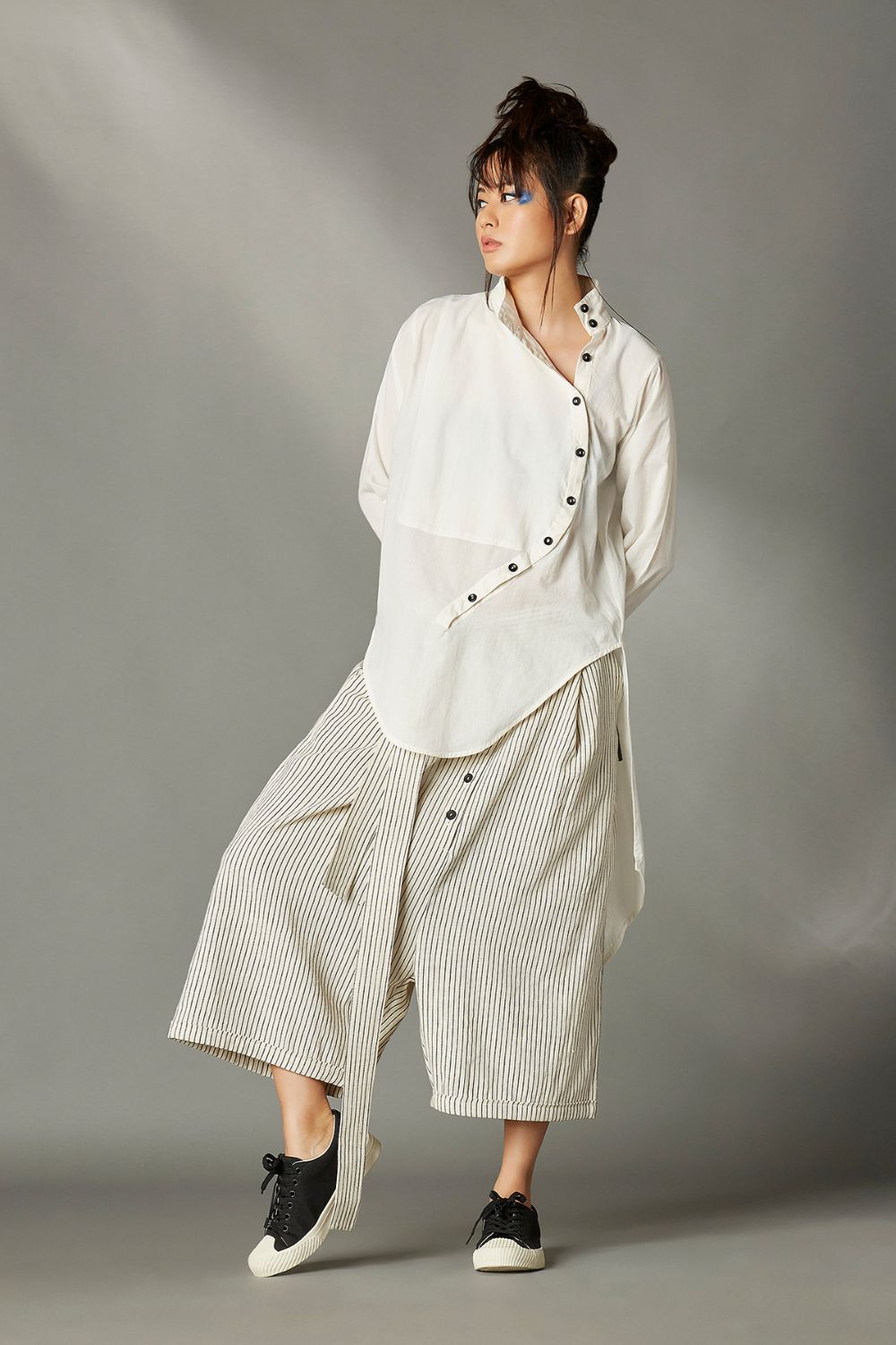 Chola’s universe begins with thoughtful materials. Recycled cottons, post-consumer fabrics, and free-cutting techniques come together in a kind of mindful choreography—one that honours form without creating waste, and prioritises movement over rigidity. This is clothing that feels lived-in yet architectural; pared-back yet quietly avant-garde.