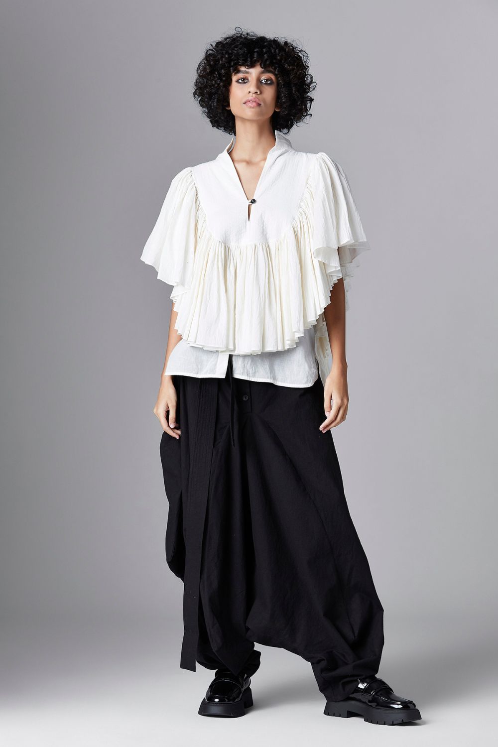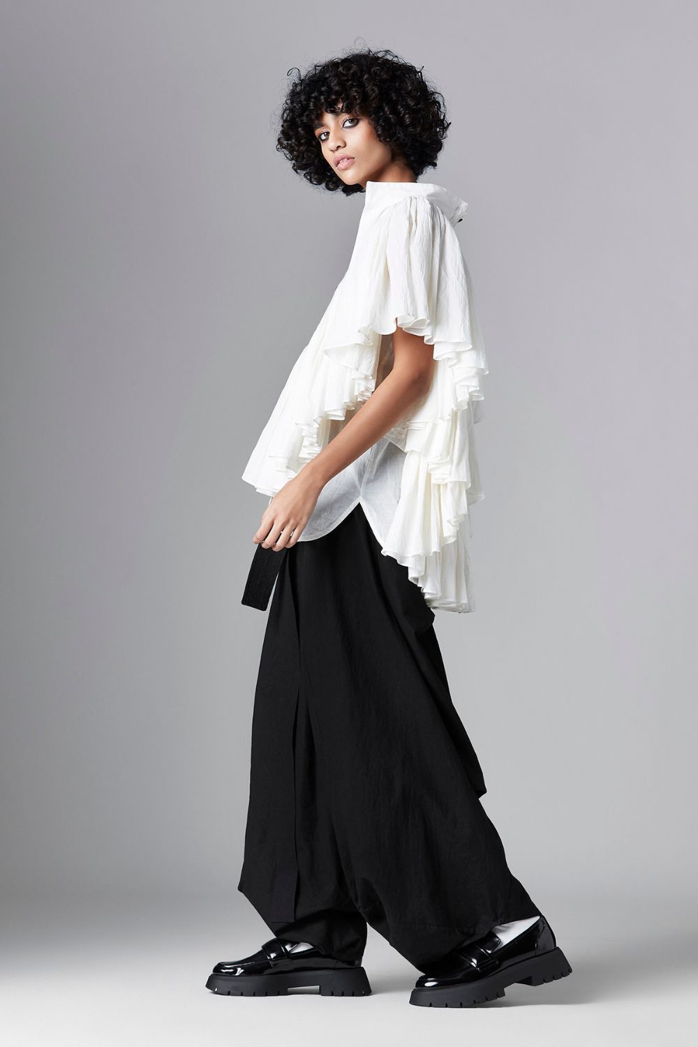 Chola’s universe begins with thoughtful materials. Recycled cottons, post-consumer fabrics, and free-cutting techniques come together in a kind of mindful choreography—one that honours form without creating waste, and prioritises movement over rigidity. This is clothing that feels lived-in yet architectural; pared-back yet quietly avant-garde.