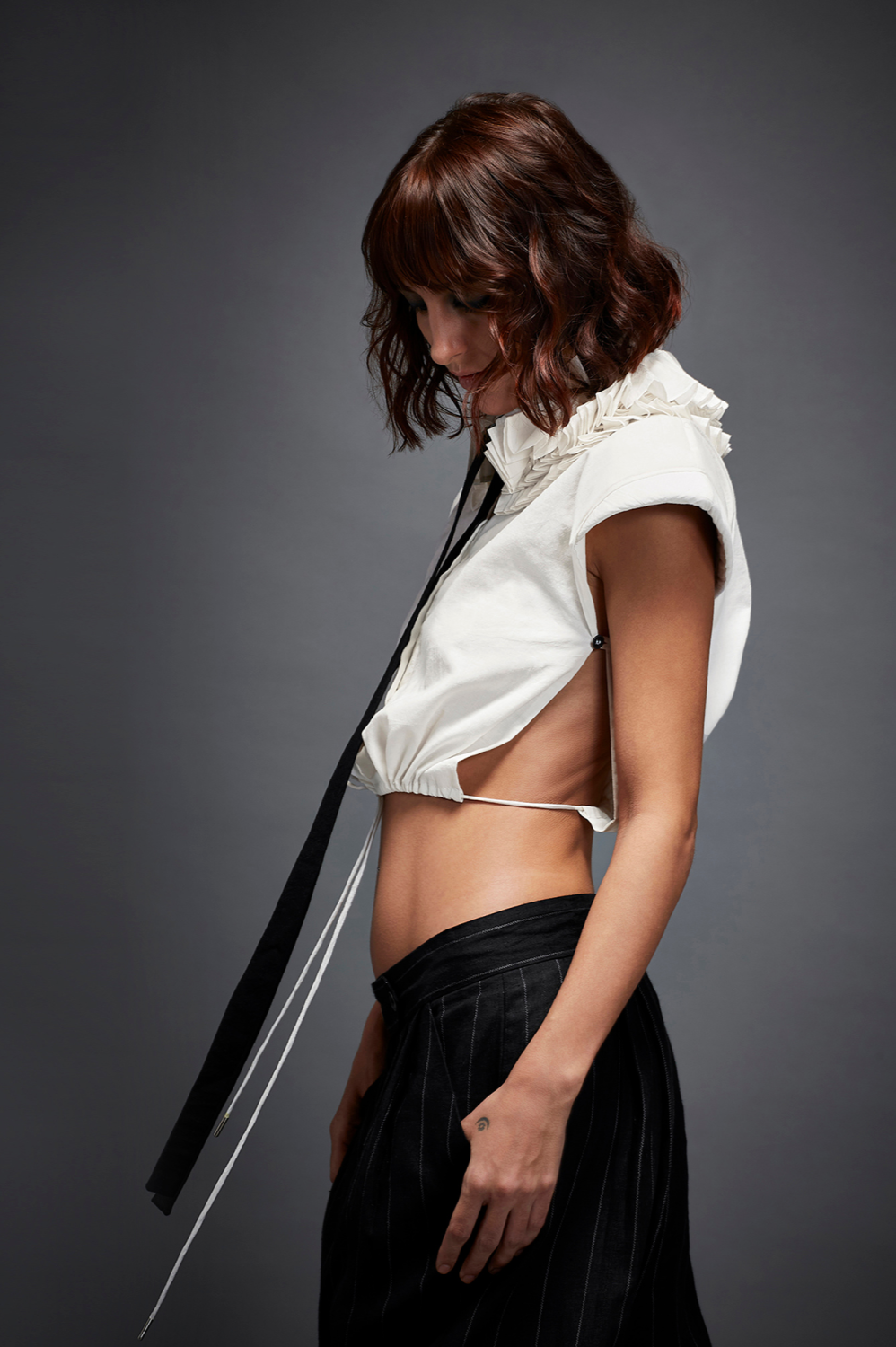 HIGH COLLAR CROP SHIRT WITH TIE UP FRILLS, BELTS, SIDE LOOP BUTTON AND DRAWSTRING AT THE HEM.