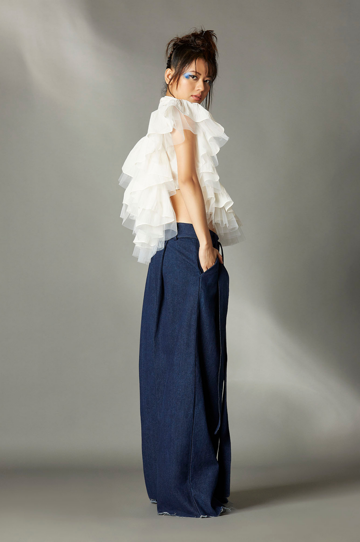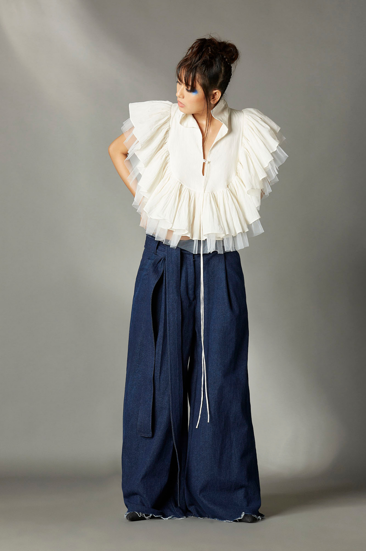 TULLE FRILL HIGH LOW SHIRT WITH HIGH COLLAR, FRONT LOOP DRAWSTRING OPENING, DRAWSTRING AT THEM AND U SHAPE YOKE AT FRONT AND BACK.