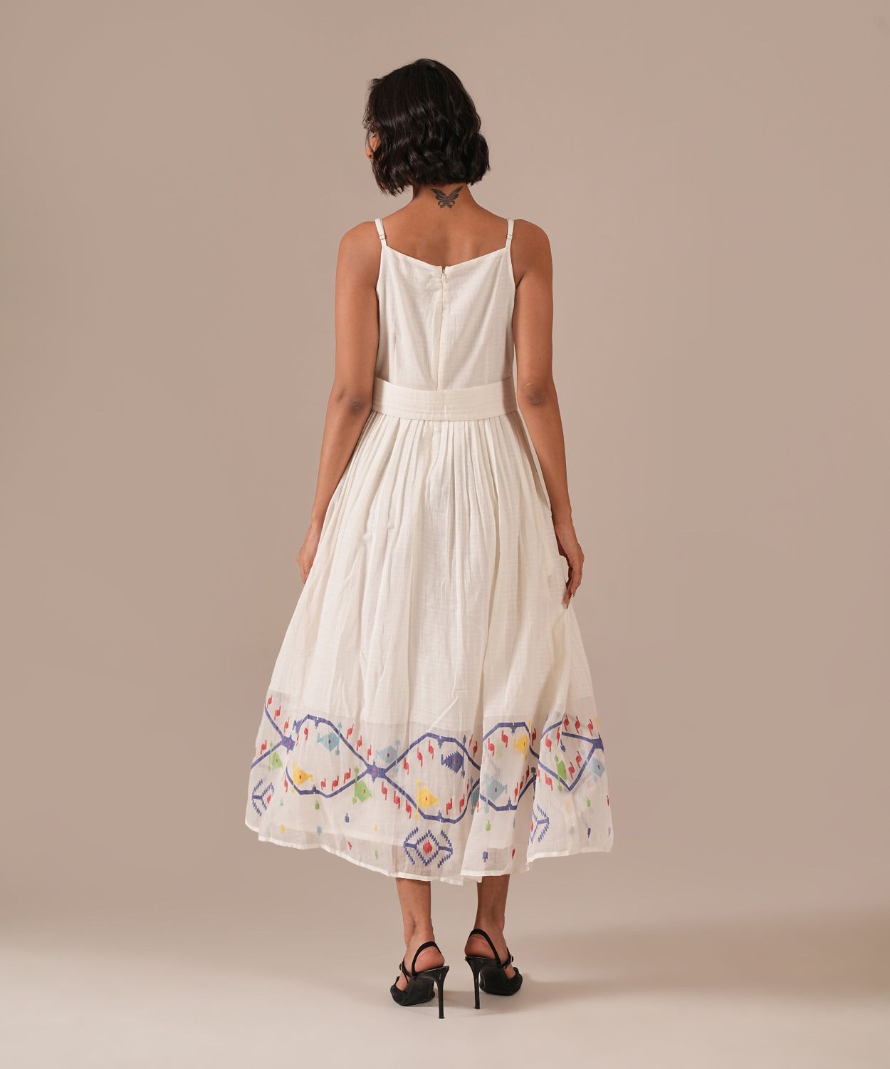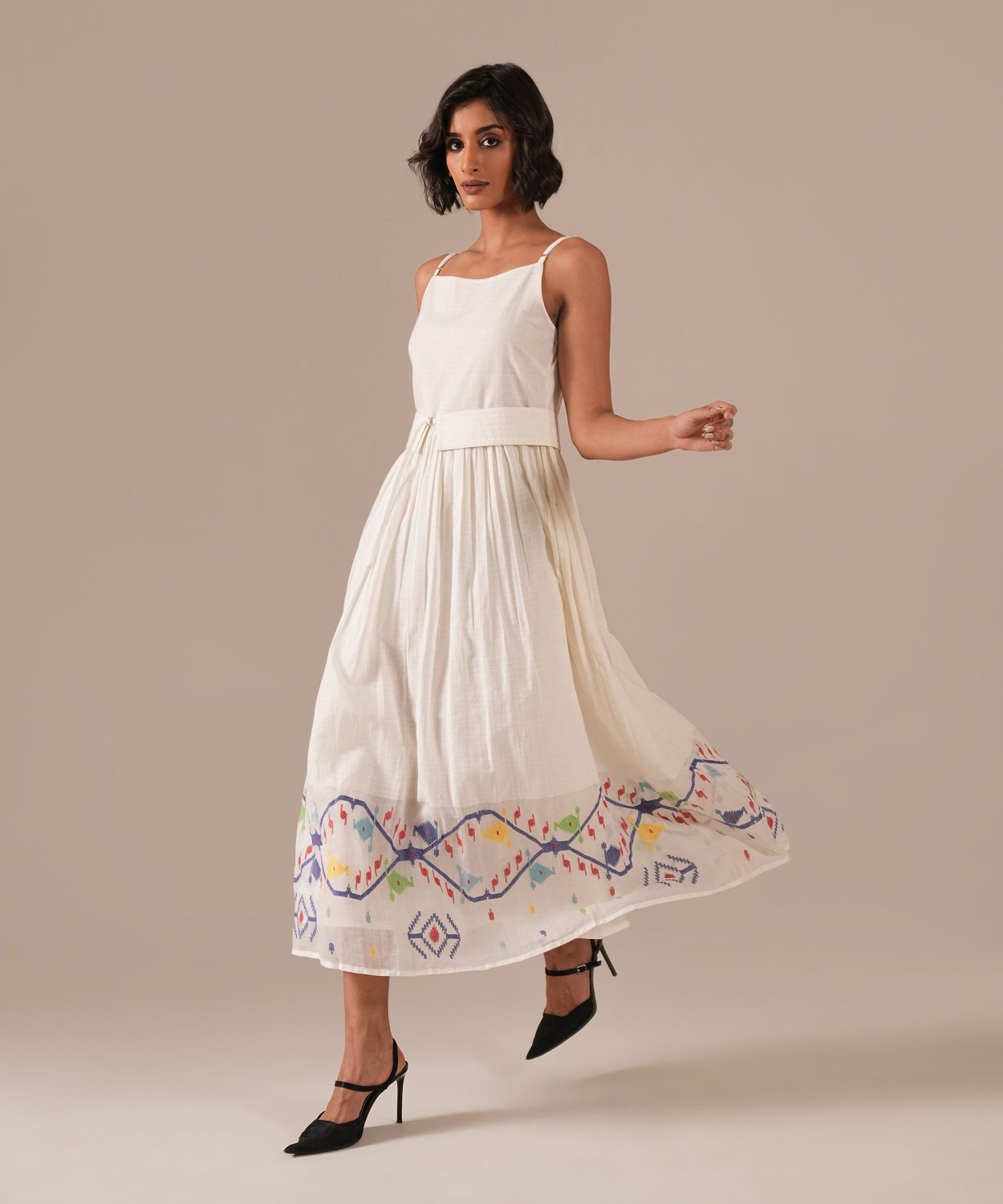 A classic Jamdani dress with a fit-and-flare silhouette, adjustable straps, and back zipper fastening, a timeless addition to a sustainable wardrobe. Handwoven by Indian artisans, it features a signature fabric belt and functional side pockets, blending artisanal craftsmanship with effortless elegance.