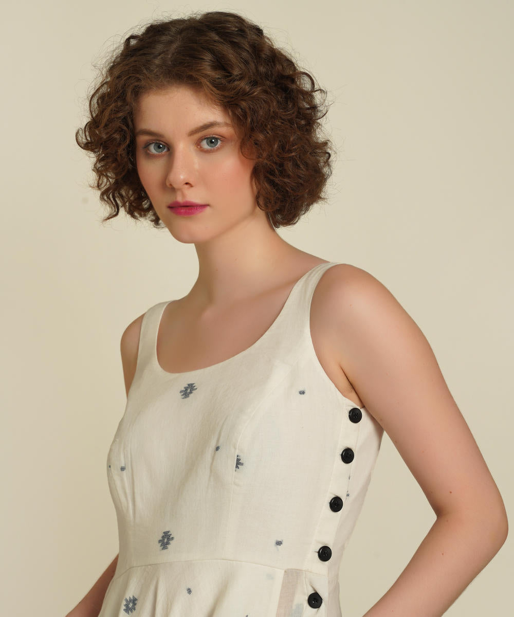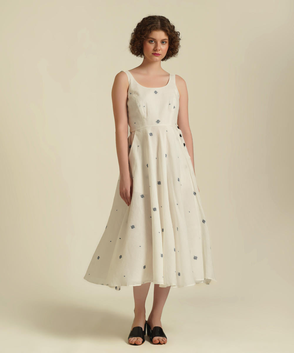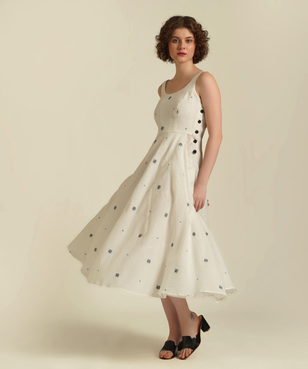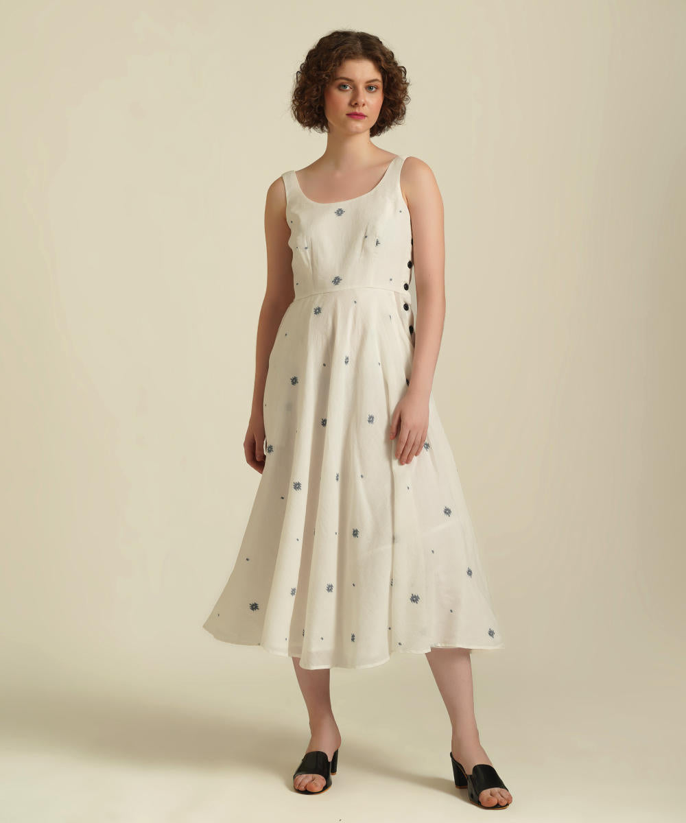 A classic fit and flare dress features fitted bodice, semi circular skirt, side button fastening and comes with side seam pockets.