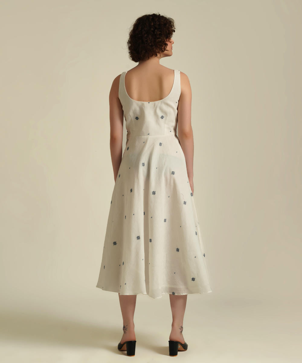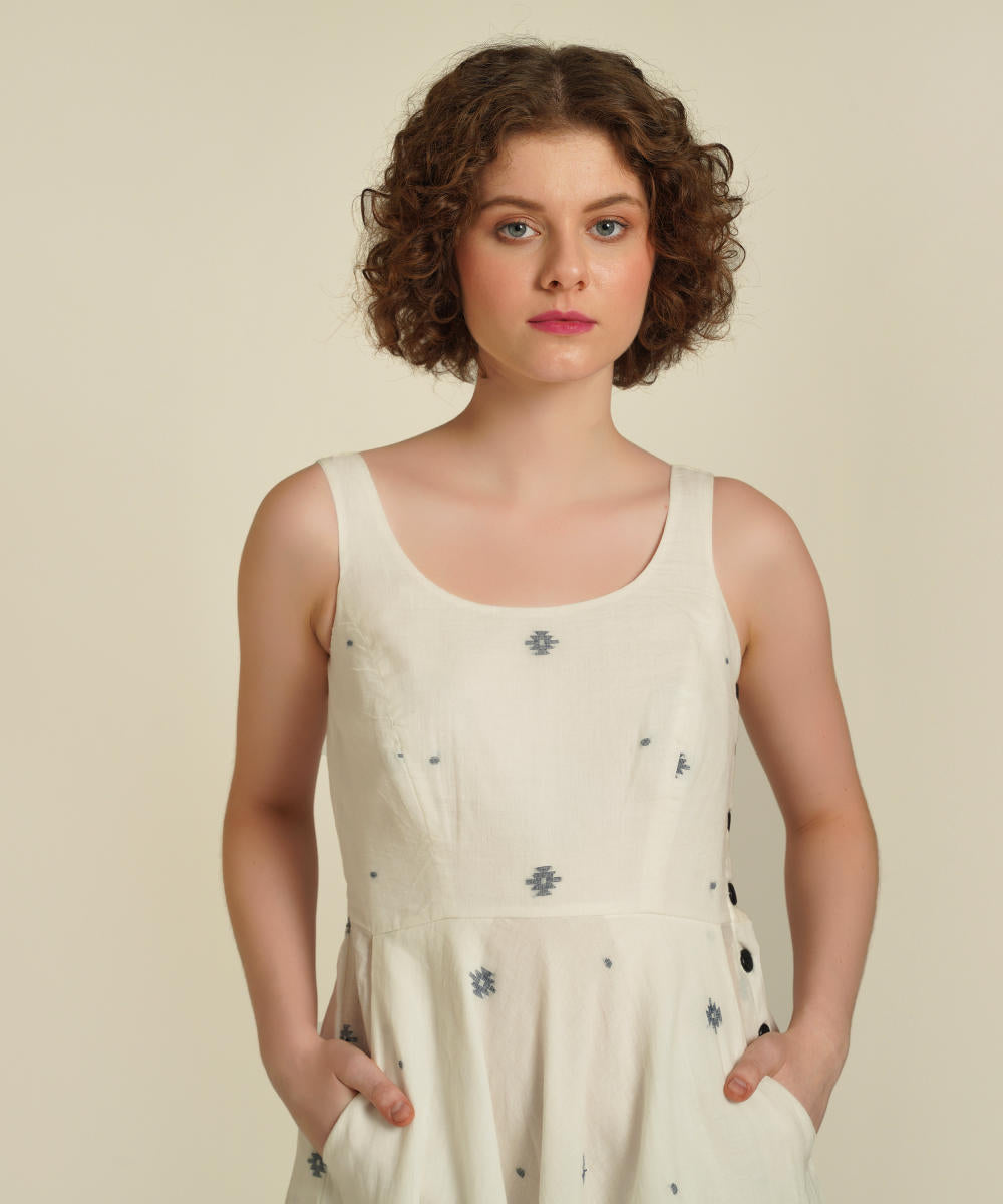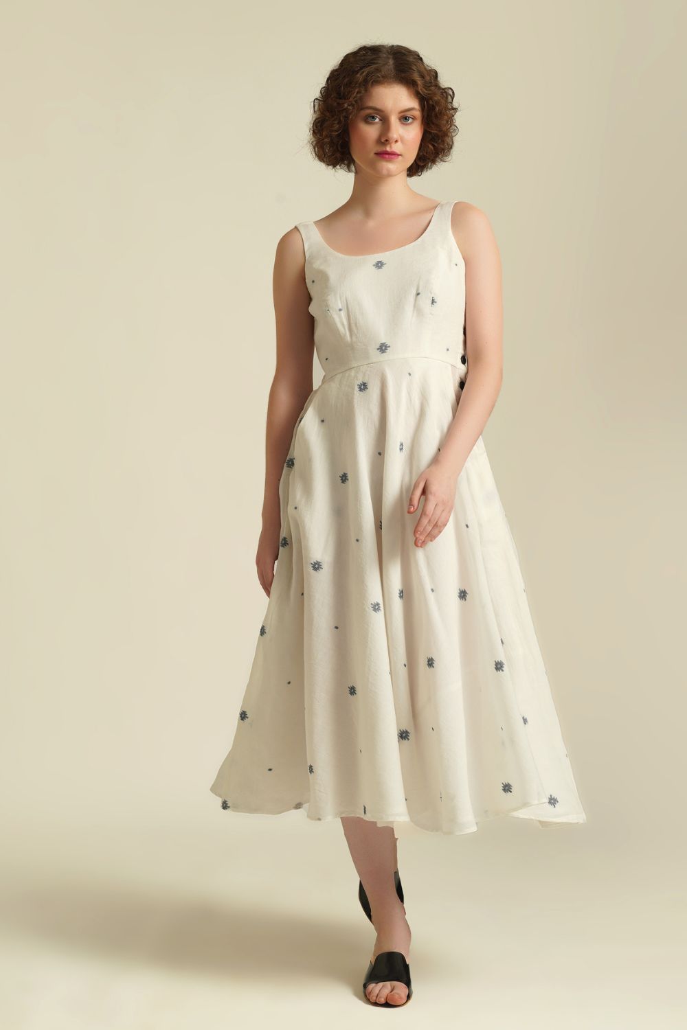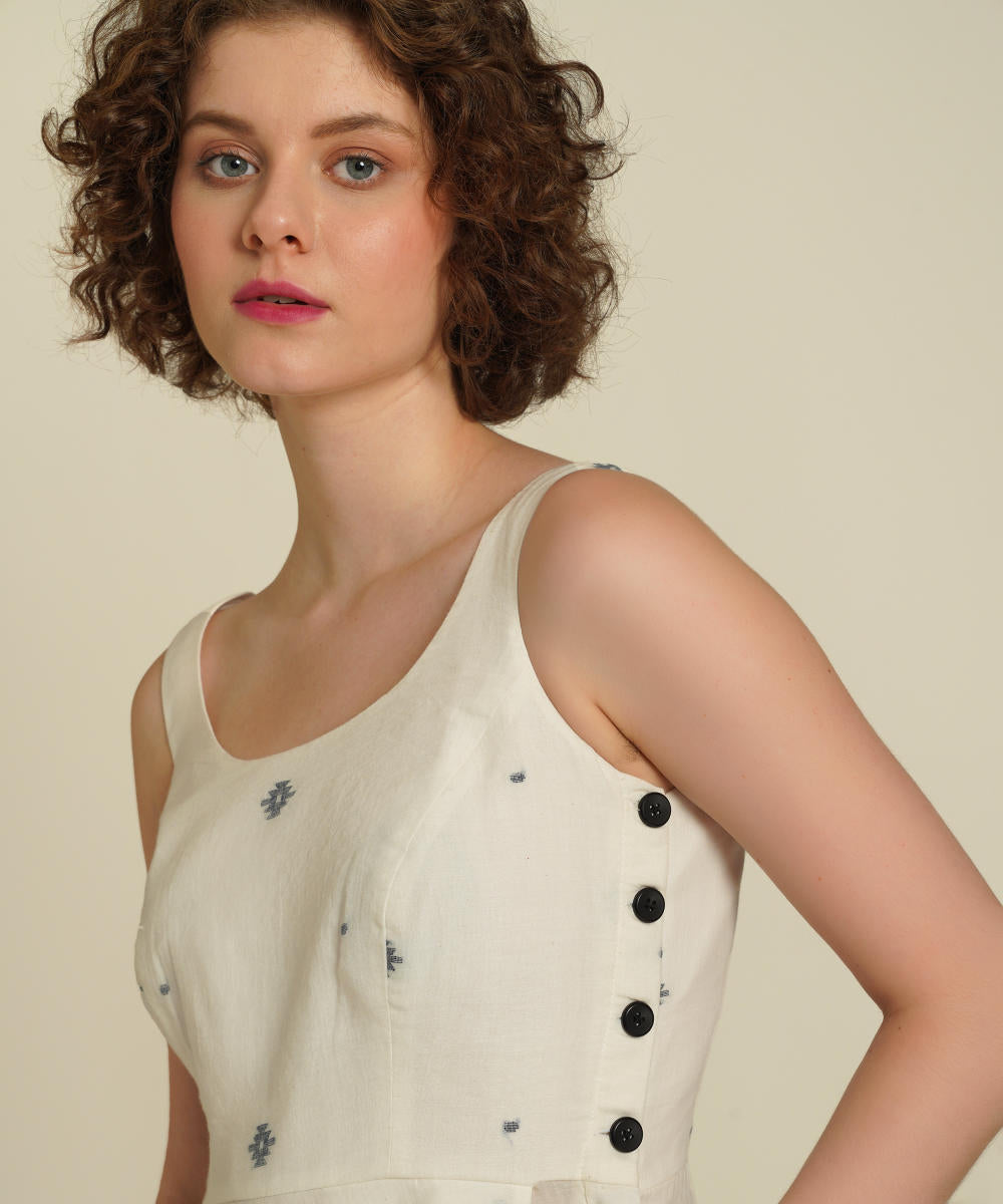 A classic fit and flare dress features fitted bodice, semi circular skirt, side button fastening and comes with side seam pockets.