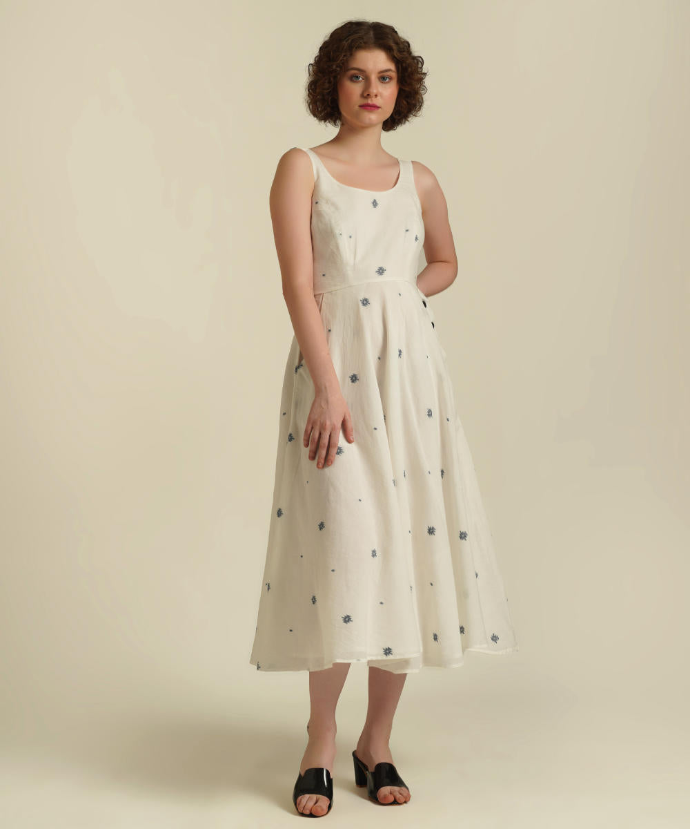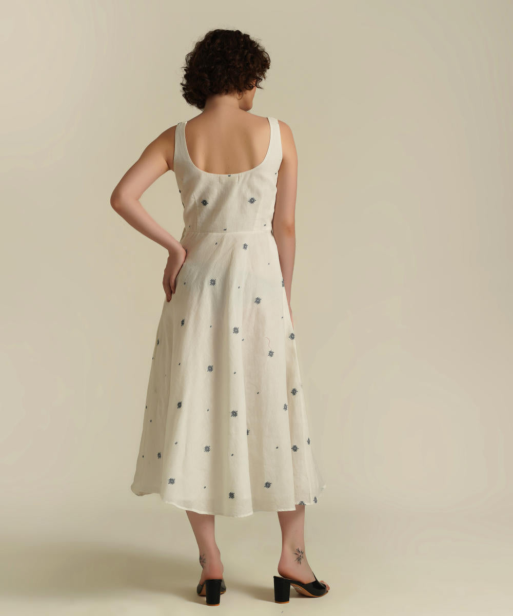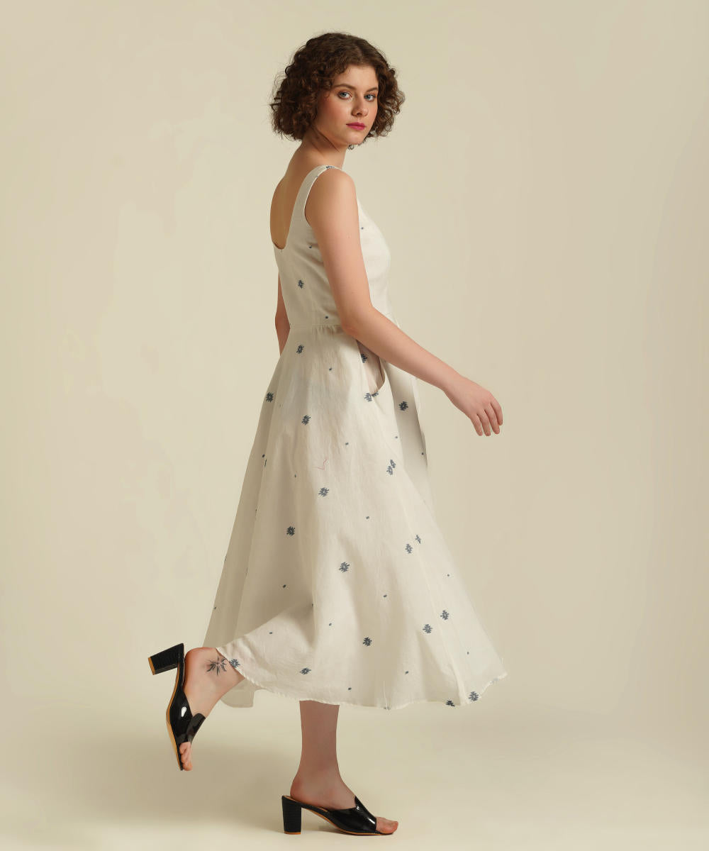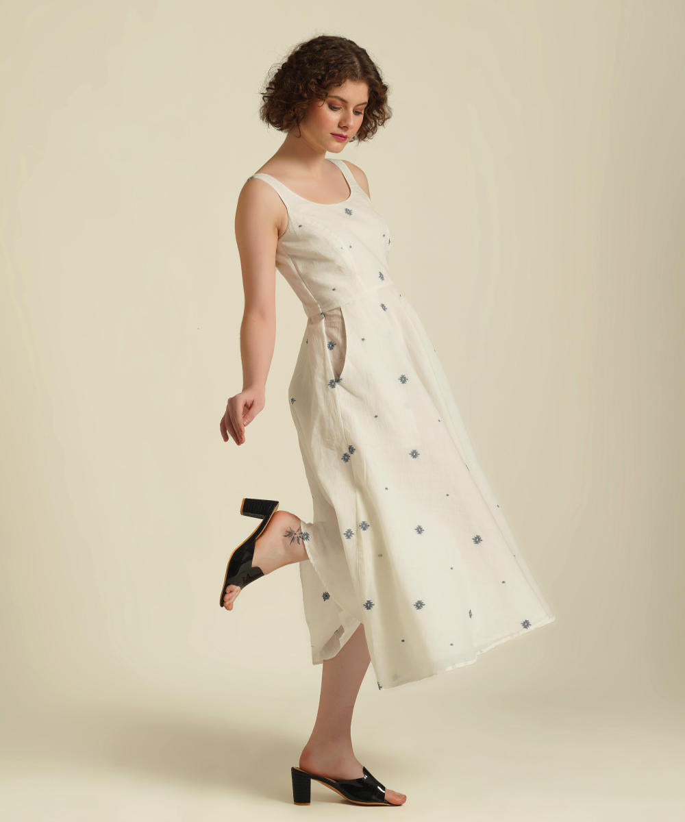 A classic fit and flare dress features fitted bodice, semi circular skirt, side button fastening and comes with side seam pockets.