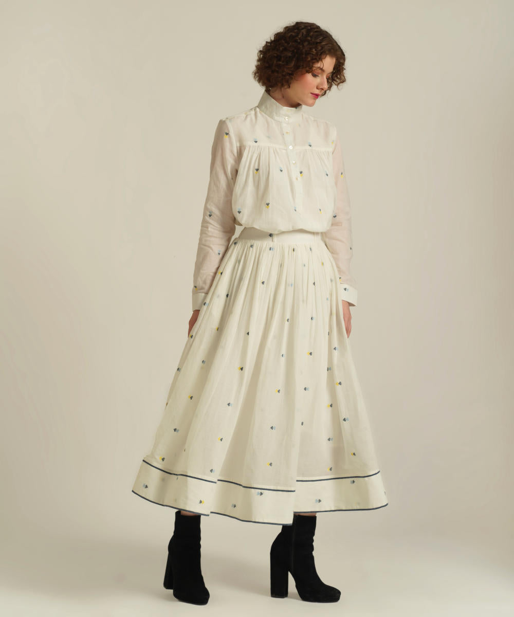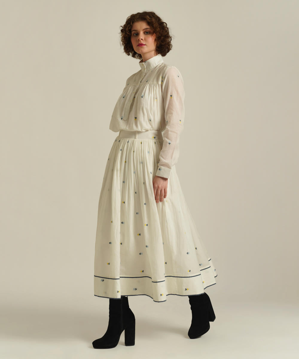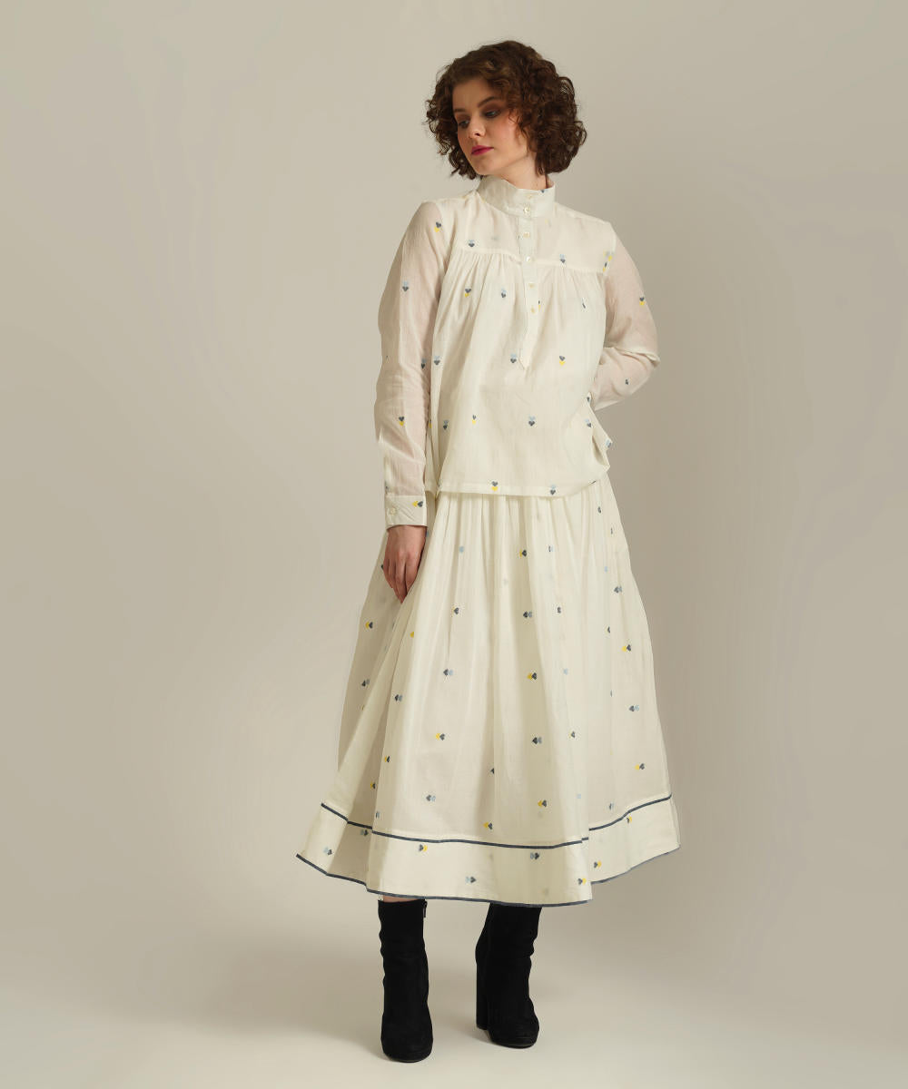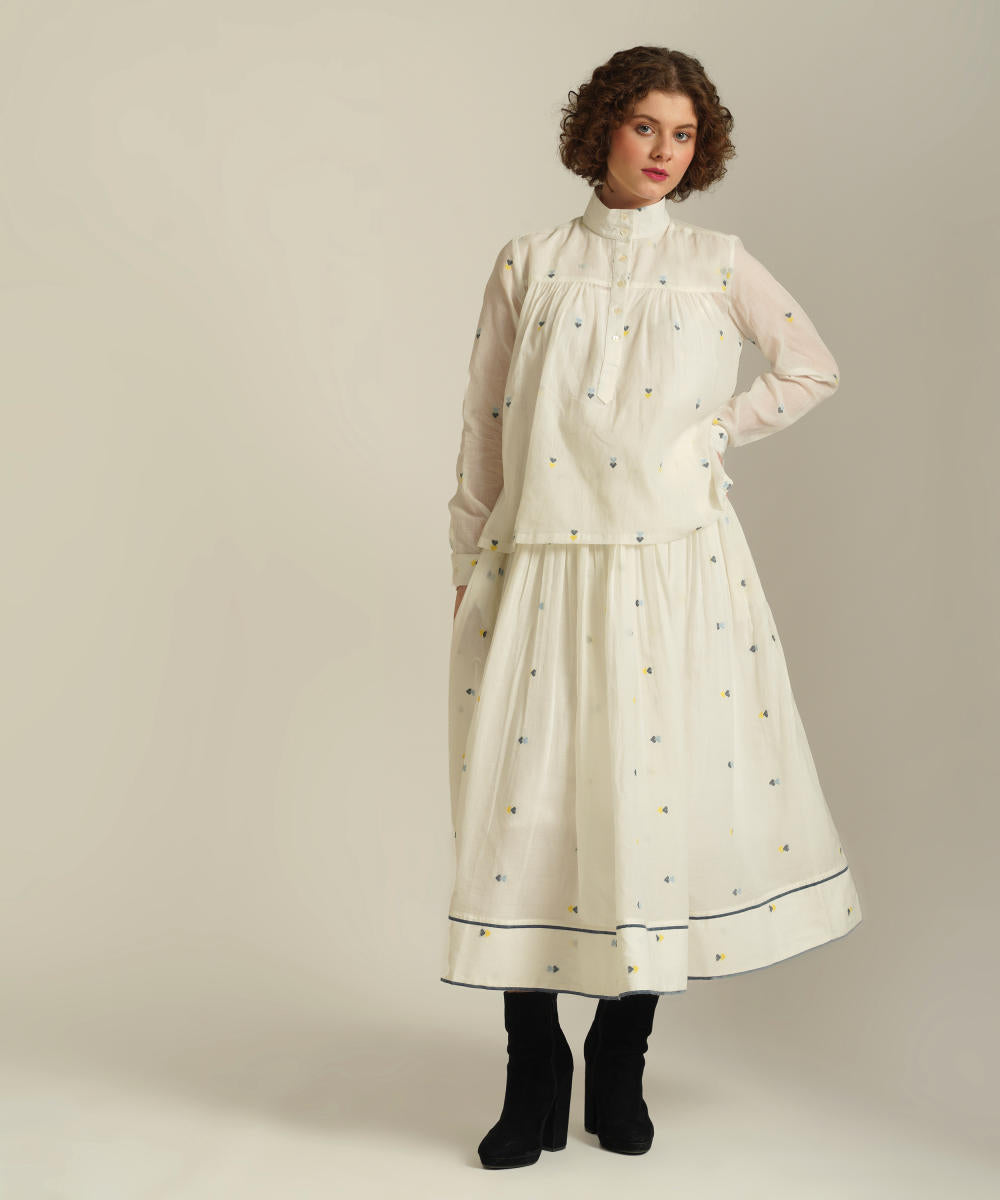 This handcrafted ensemble features a gathered skirt with selvage detailing, side pockets and a co-ord high collared top. This set also comes with a separate cotton slip and removable tie belt for styling.