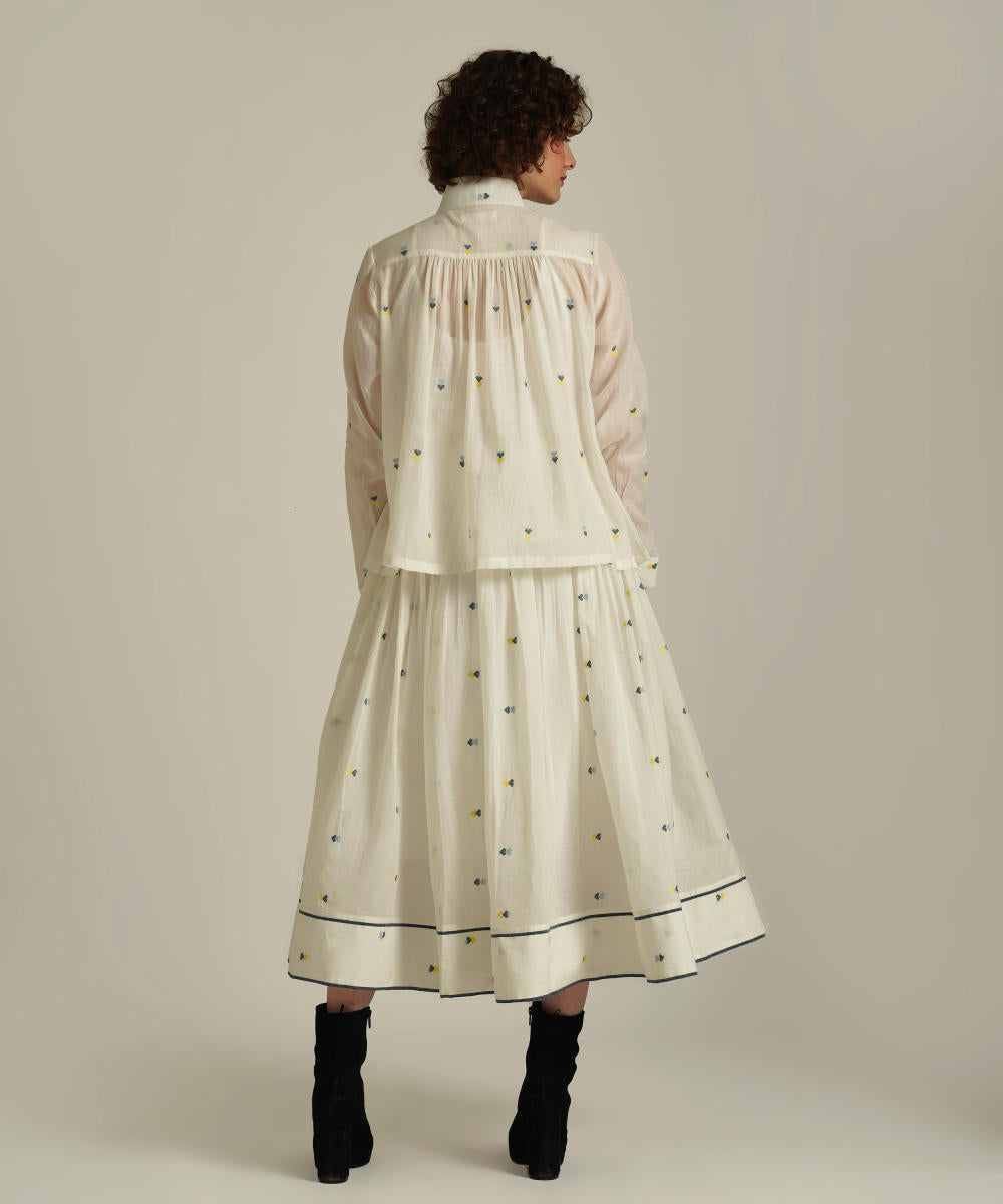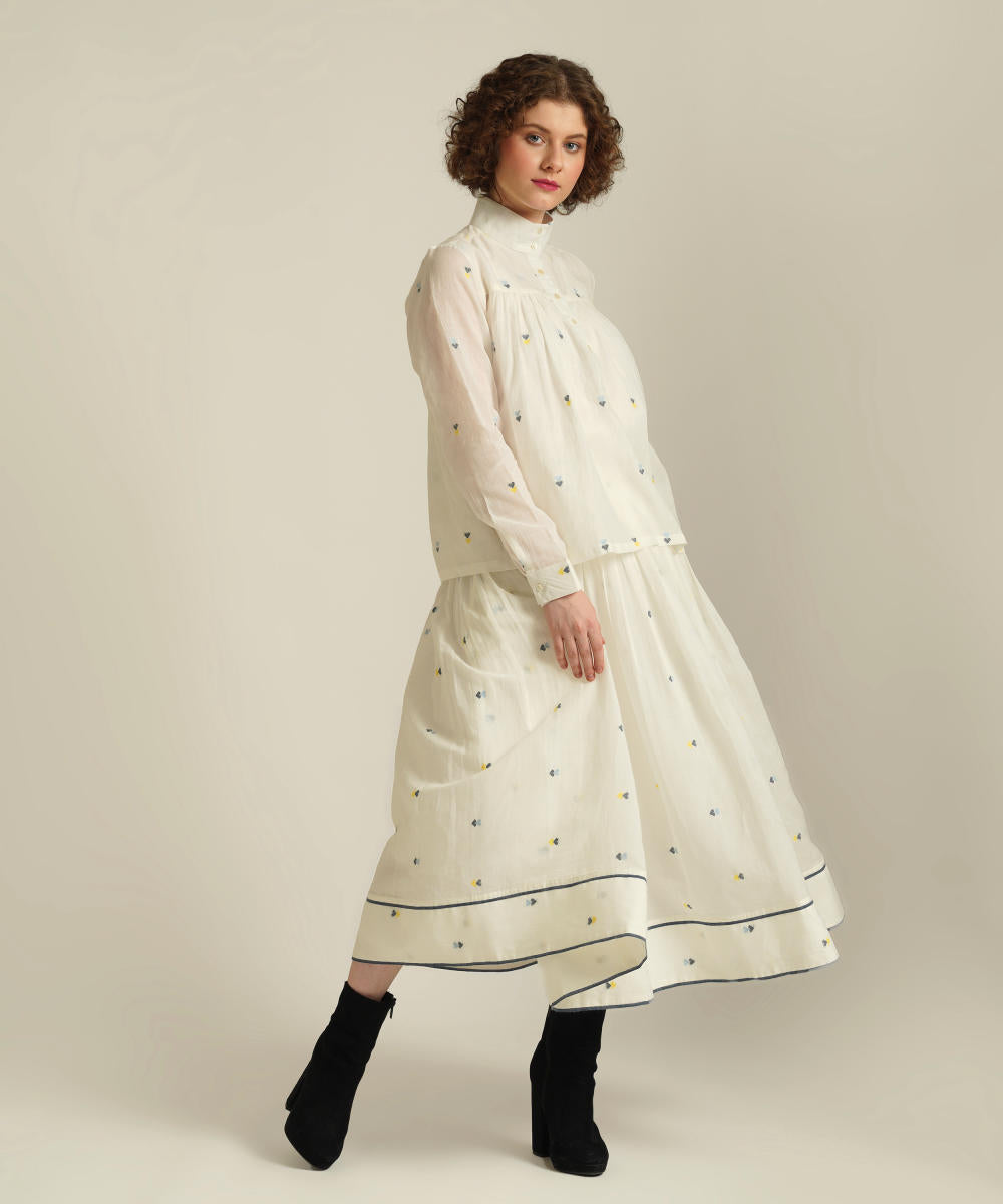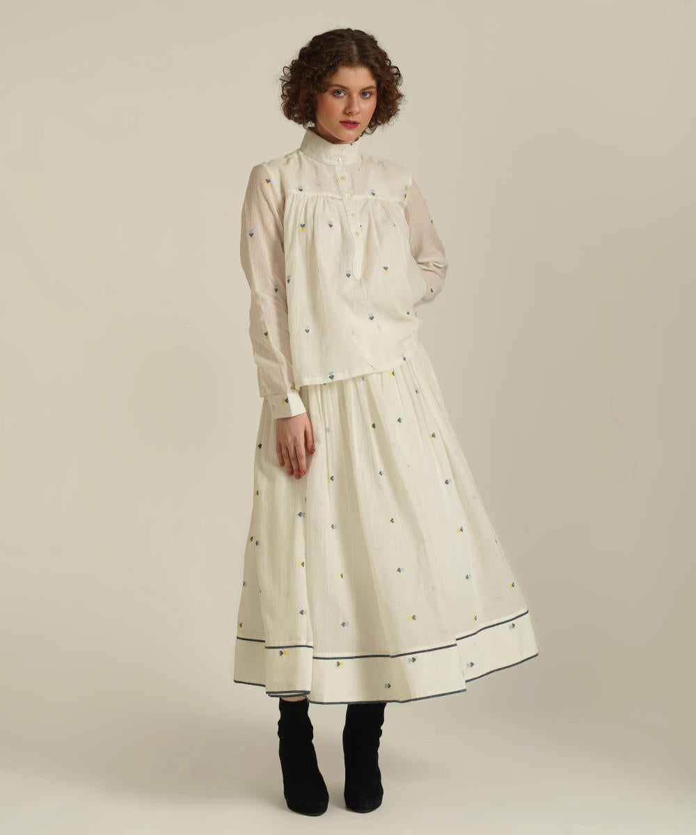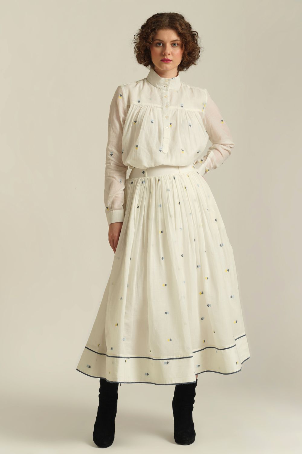 This handcrafted ensemble features a gathered skirt with selvage detailing, side pockets and a co-ord high collared top. This set also comes with a separate cotton slip and removable tie belt for styling.