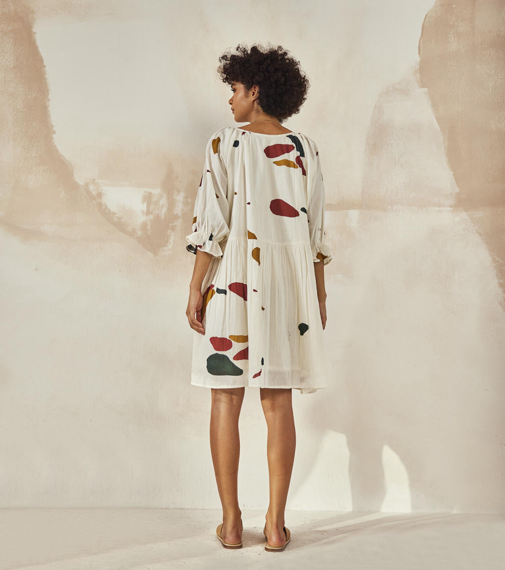 A mosaic printed flounce dress in mulmul with semi long sleeves, a zipper closure at the back and an attached lining.