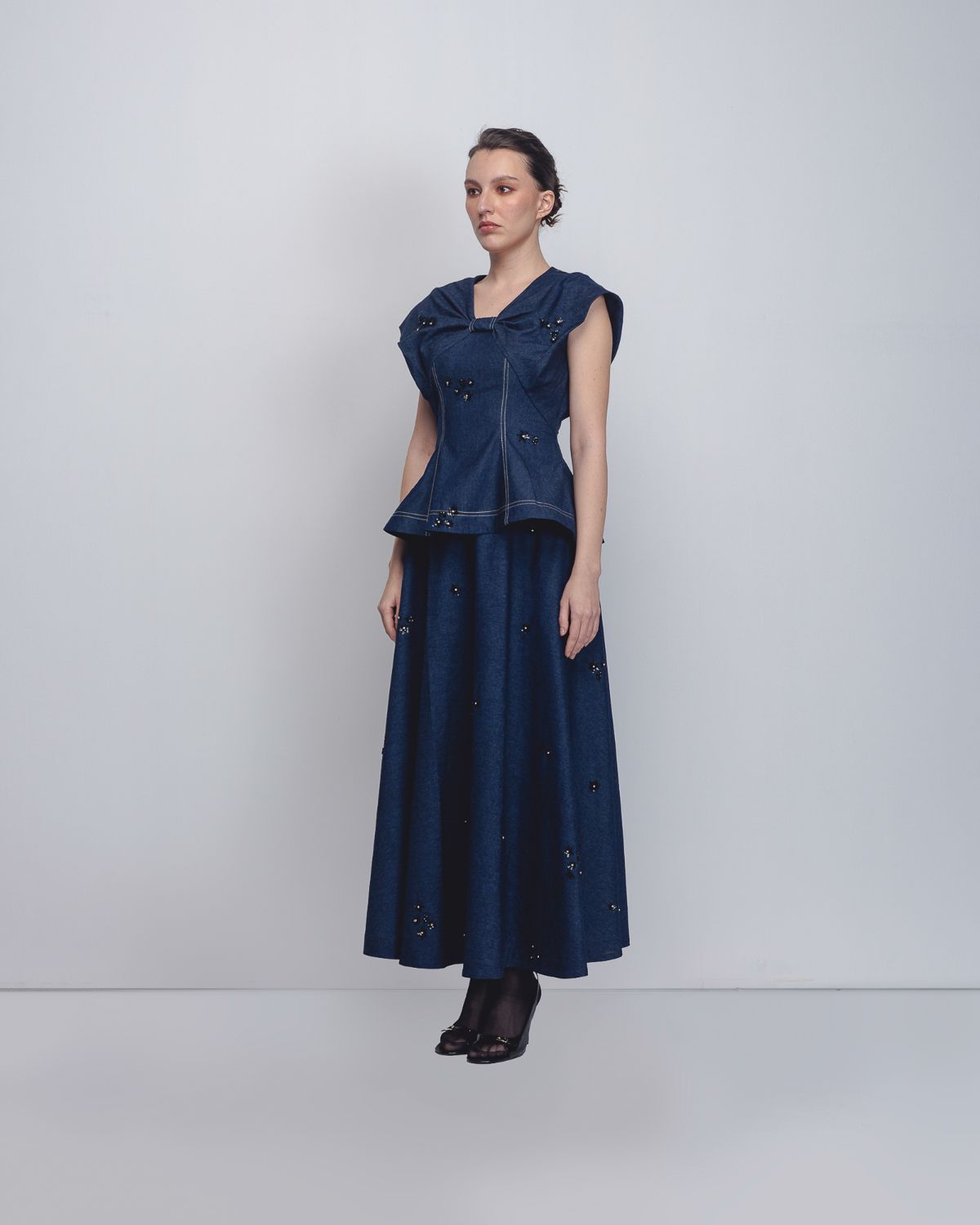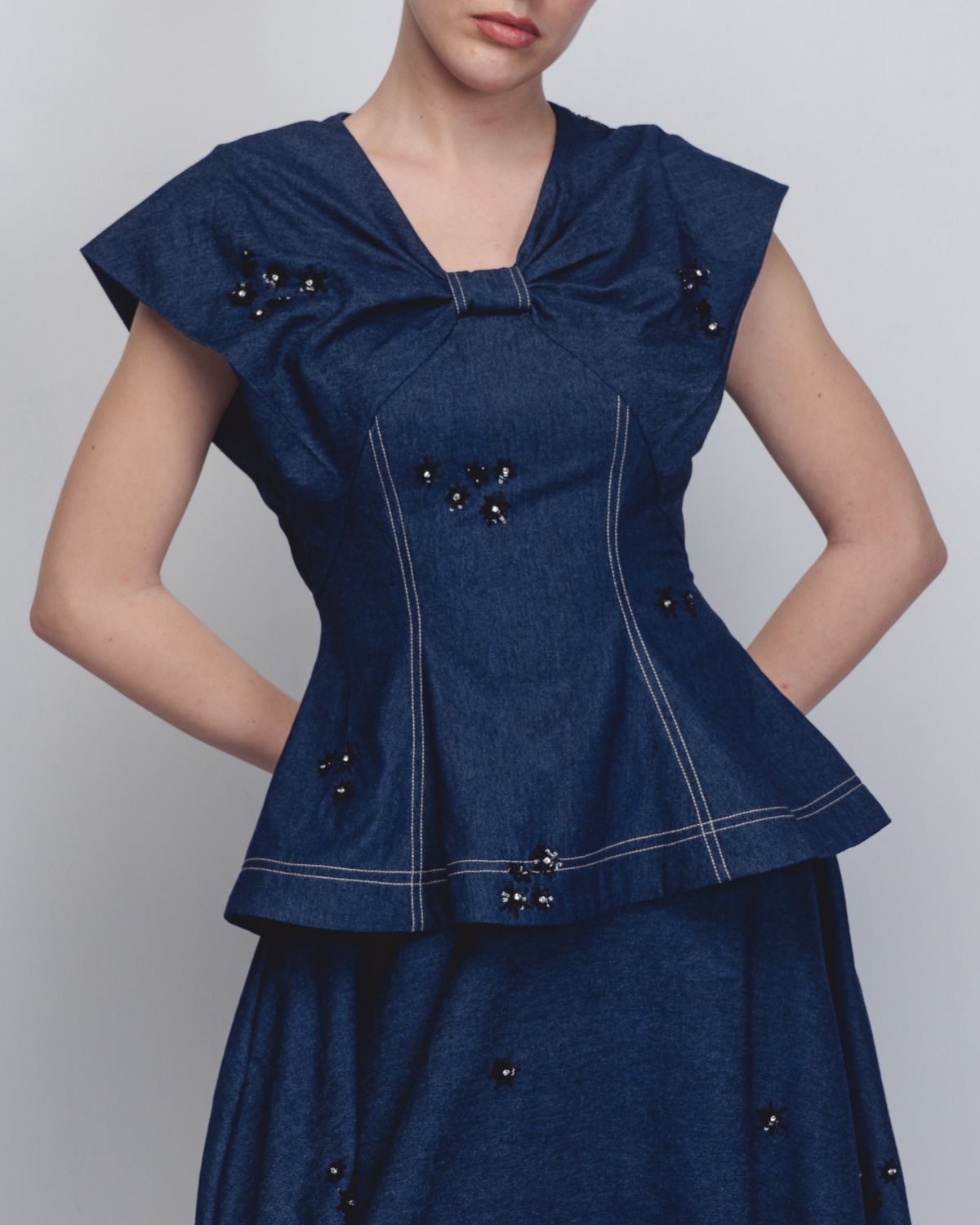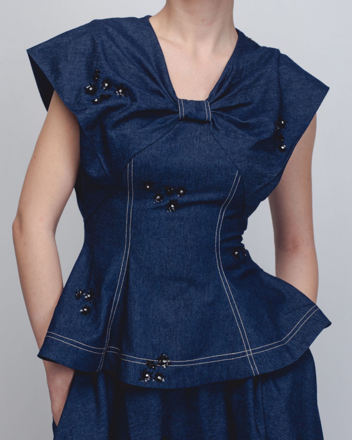 Crafted in handwoven khadi denim, this top explores sculptural construction through a distinctive bow-inspired silhouette. Cut in panels, the garment contours the waistline before subtly flaring toward the hem, creating a structured yet playful form. The textile surface is artisanally hand-embellished with thread and sequin detailing, adding depth, texture, and a refined shimmer to the piece. The model is 5'10", and the garment length is 25 inches.