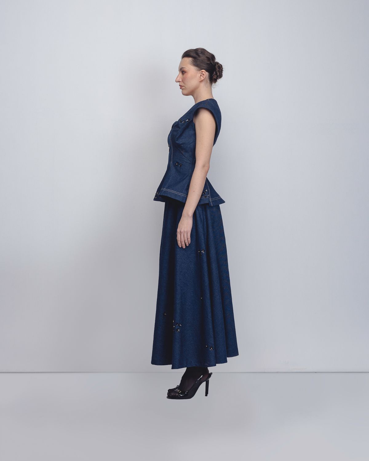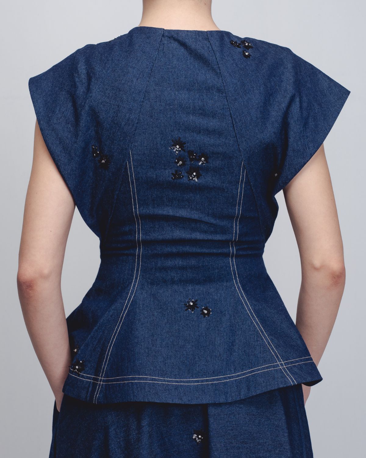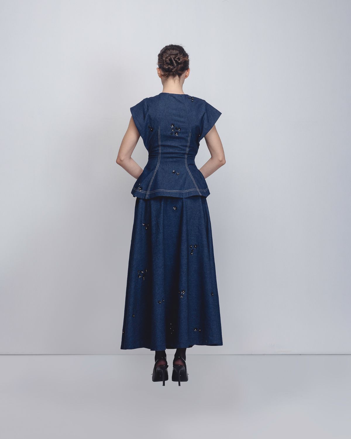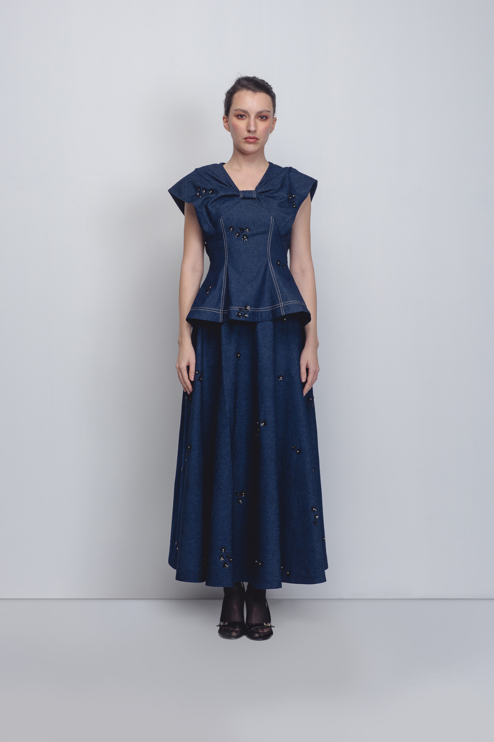 Crafted in handwoven khadi denim, this top explores sculptural construction through a distinctive bow-inspired silhouette. Cut in panels, the garment contours the waistline before subtly flaring toward the hem, creating a structured yet playful form. The textile surface is artisanally hand-embellished with thread and sequin detailing, adding depth, texture, and a refined shimmer to the piece. The model is 5'10", and the garment length is 25 inches.