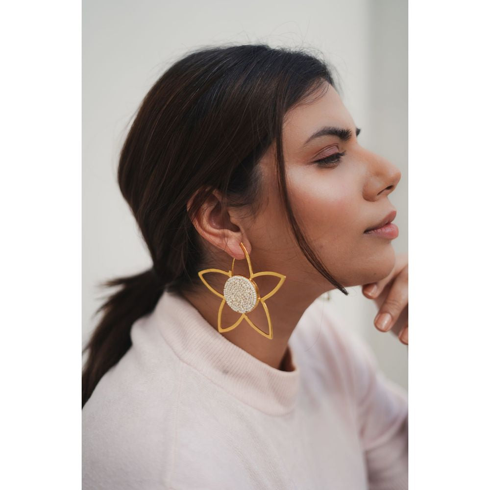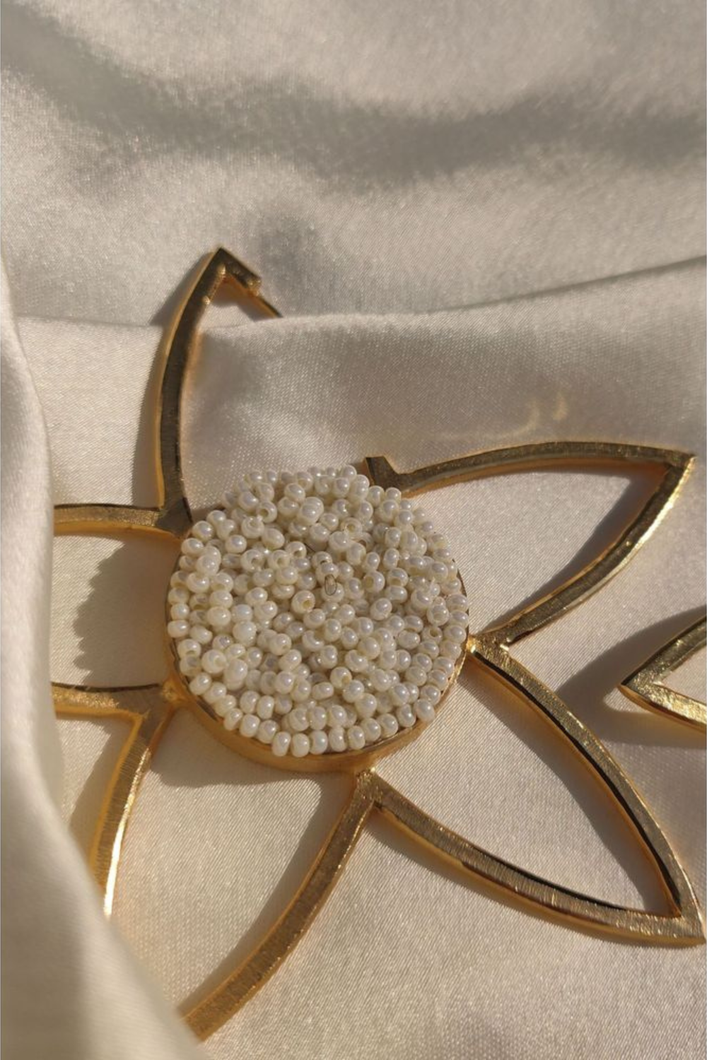 A beautiful pair inspired by the line drawing of the flower. A cluster of beads hand embroidered on a fabric, framed with brass.