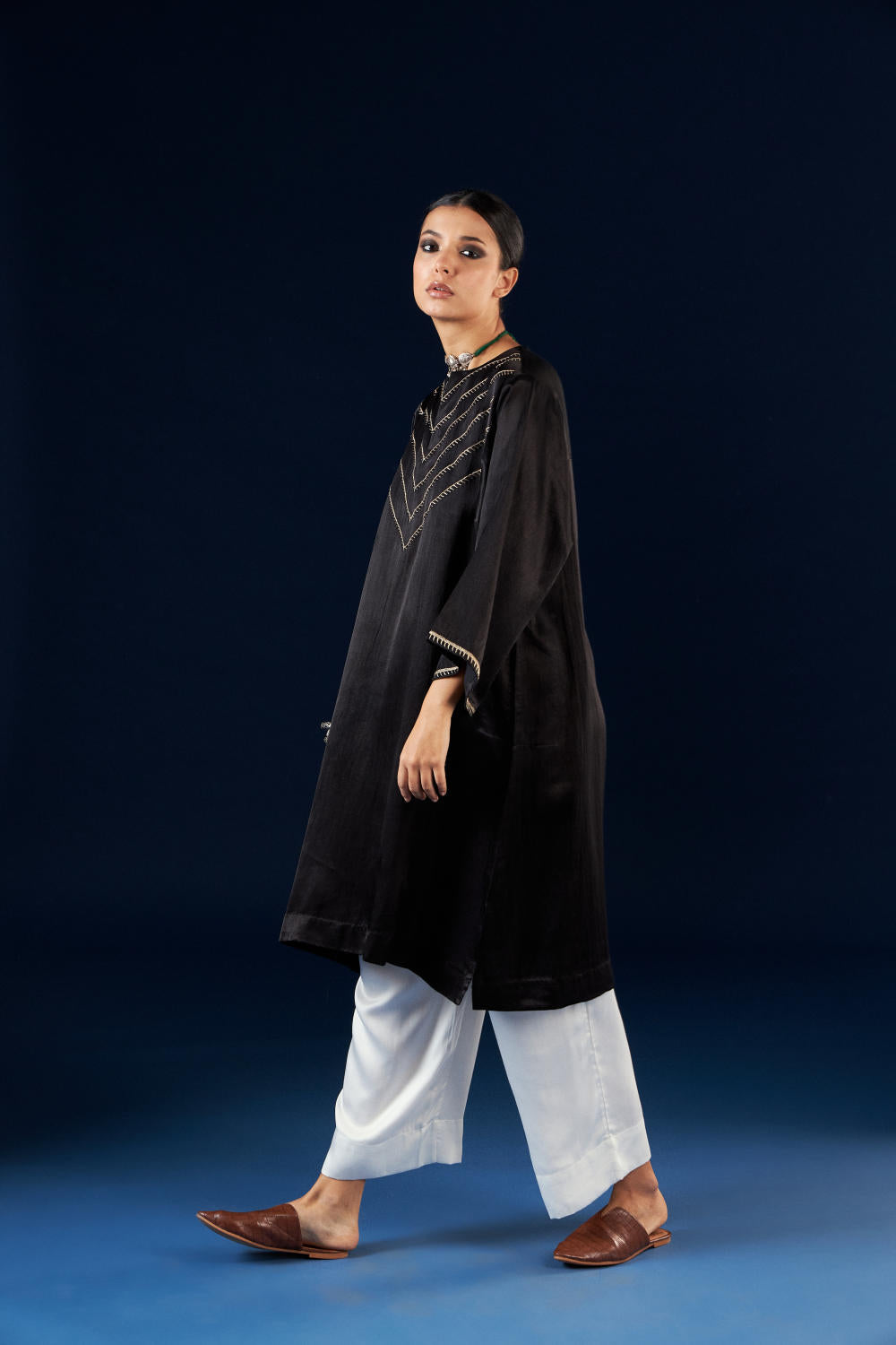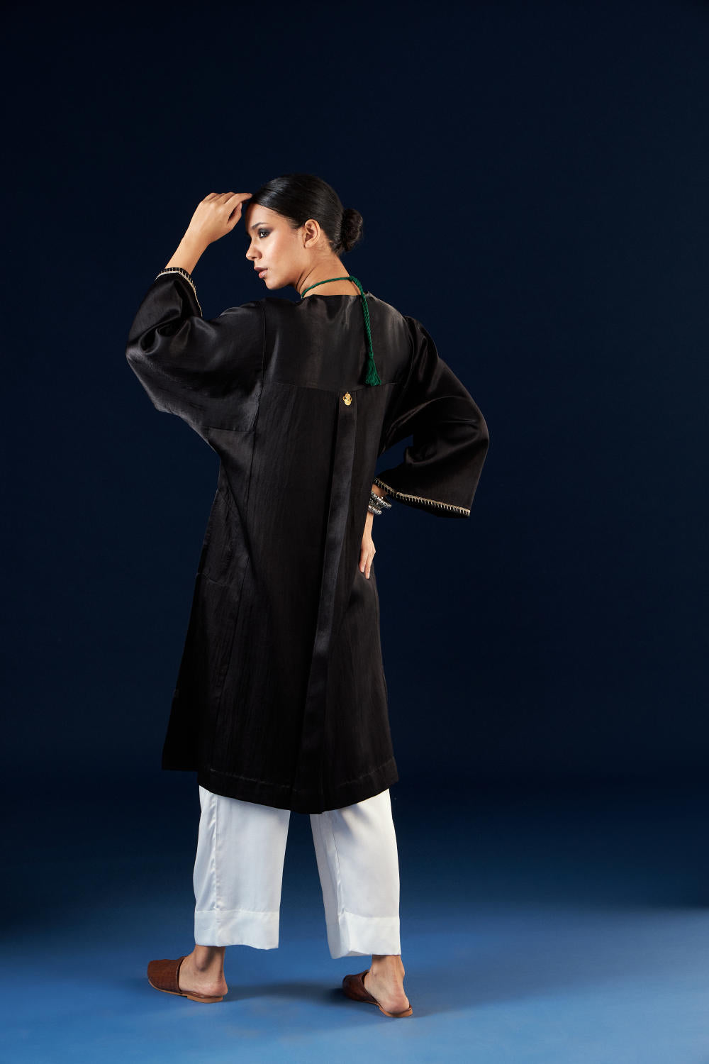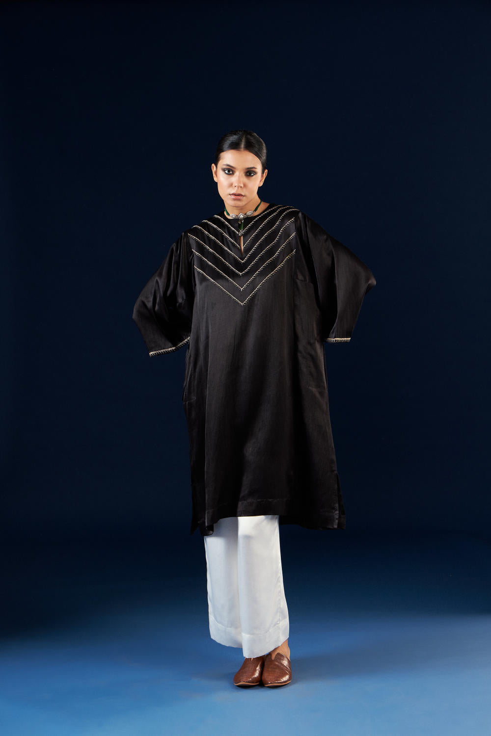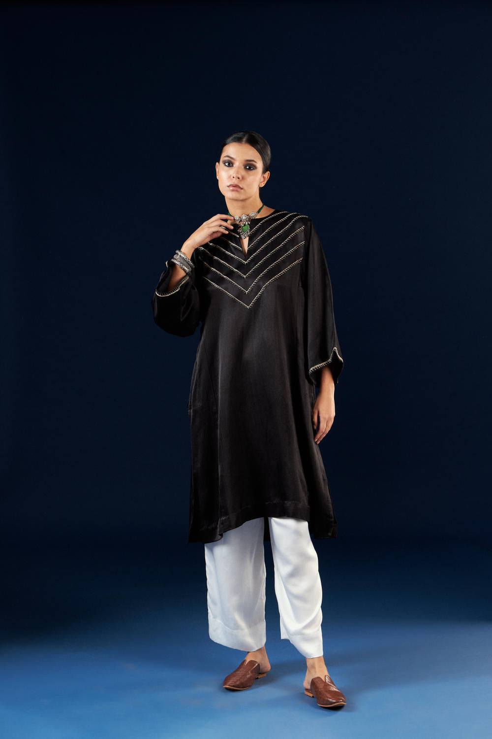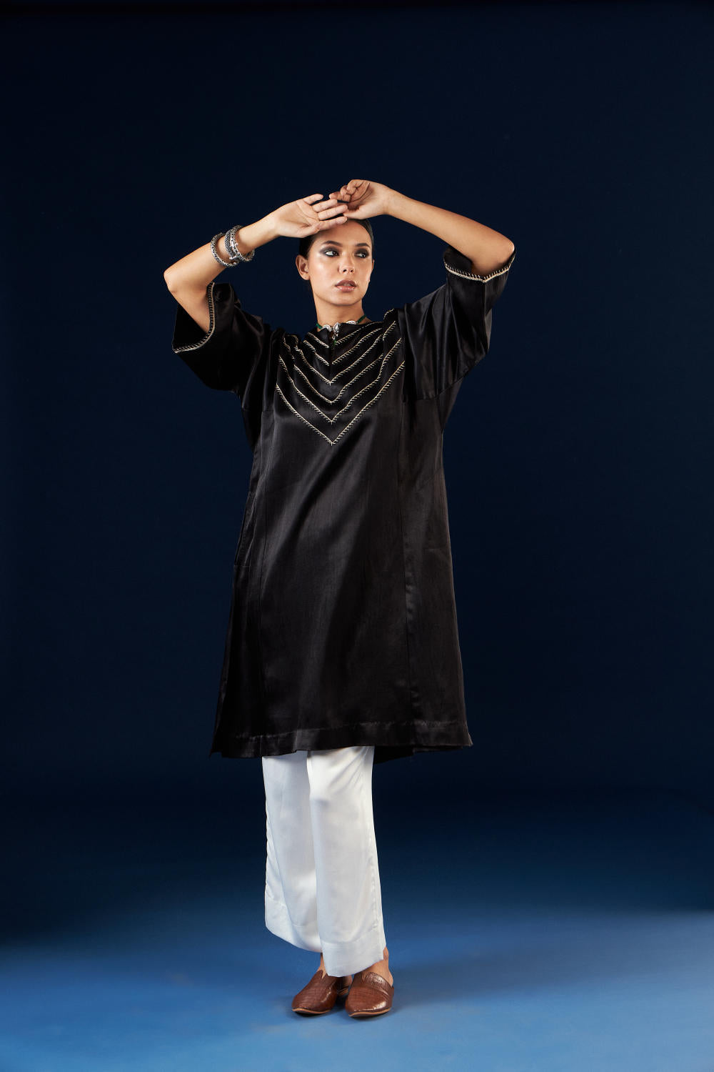 Aavidi’s language is one of soft architecture: silhouettes that breathe, fabrics that hold memory, and surface techniques — from clamp dyeing to block printing — that carry the imprint of time. Here, simplicity isn’t minimalism; it’s clarity. A grounding. A return.