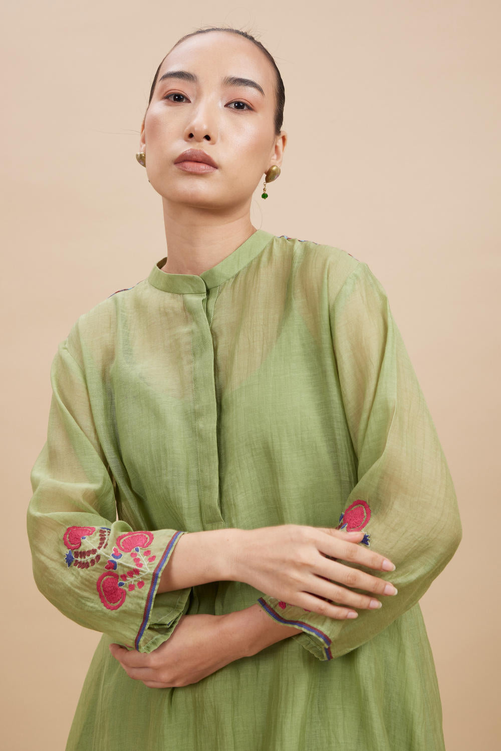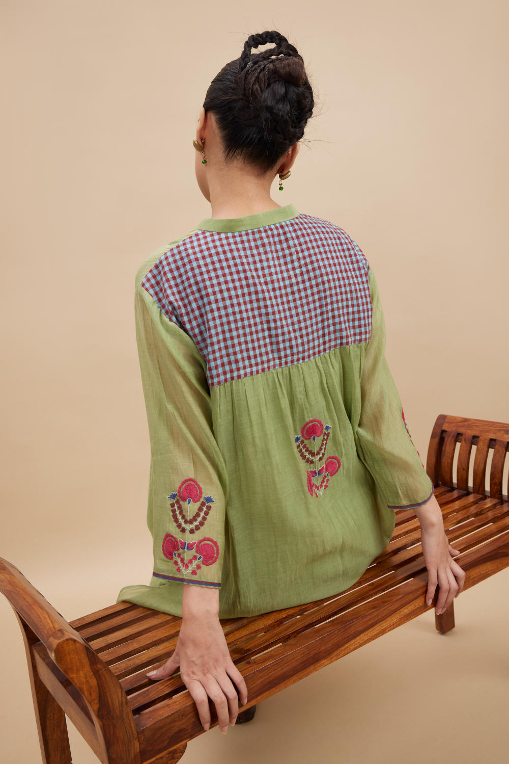 Aavidi’s language is one of soft architecture: silhouettes that breathe, fabrics that hold memory, and surface techniques — from clamp dyeing to block printing — that carry the imprint of time. Here, simplicity isn’t minimalism; it’s clarity. A grounding. A return.