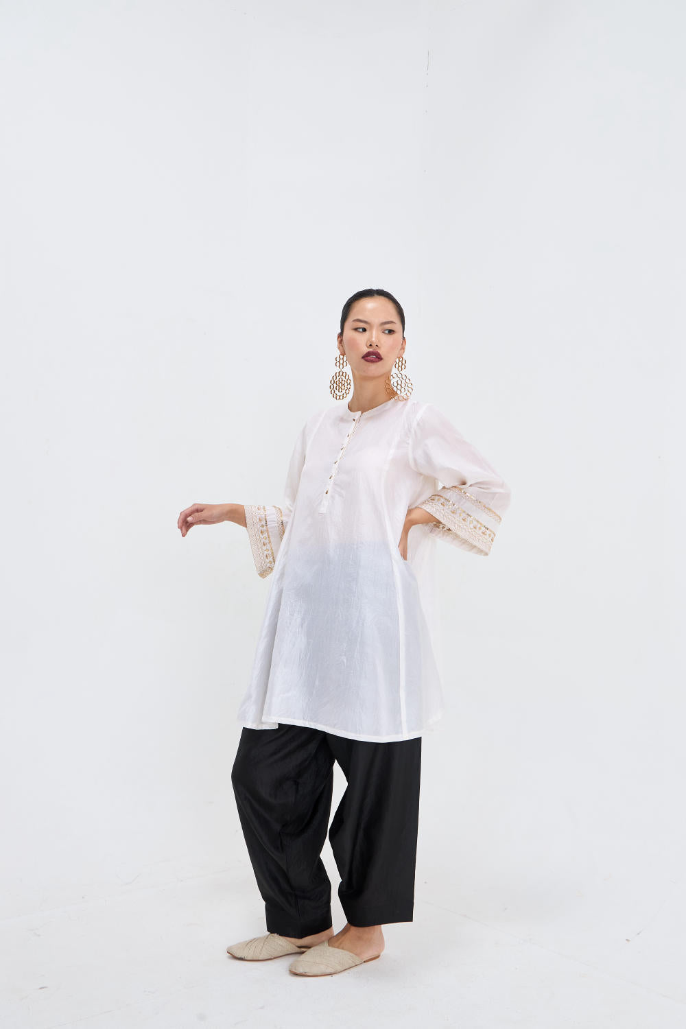 This elegant Mysore silk ensemble features a short kalidaar kurta adorned with intricate jari embroidery and paired with comfortable Pakistani pants. Perfect for a sophisticated yet timeless look.