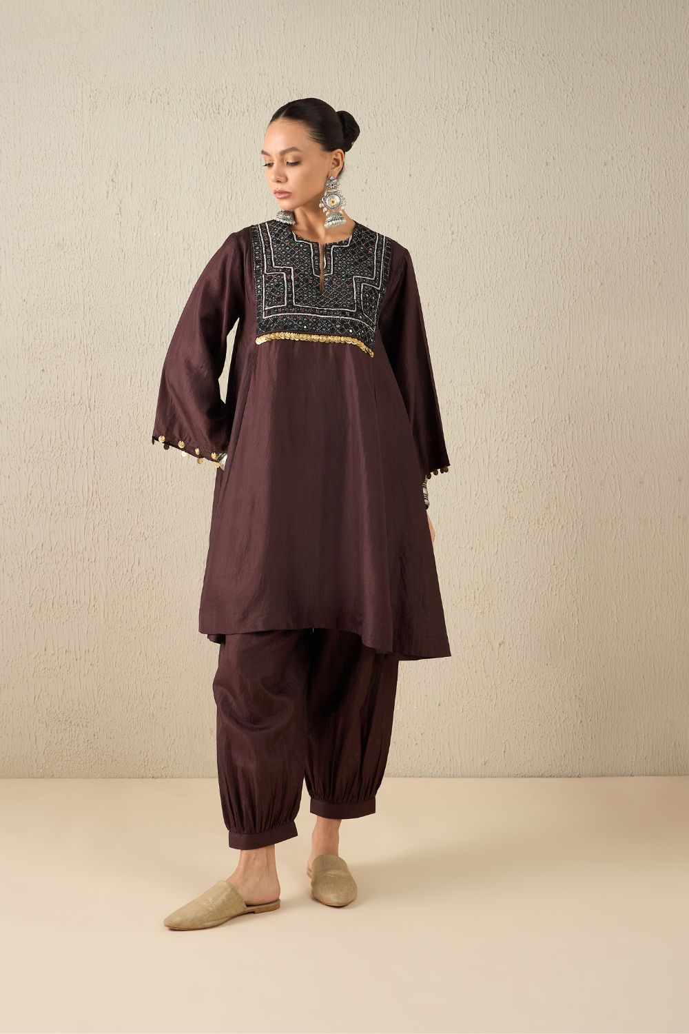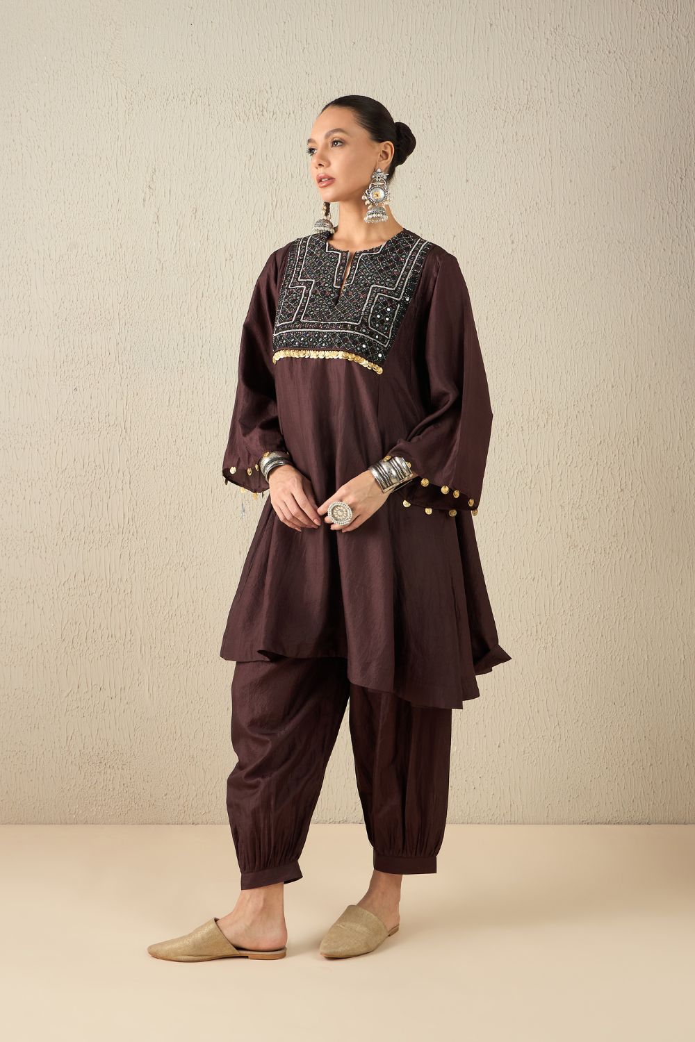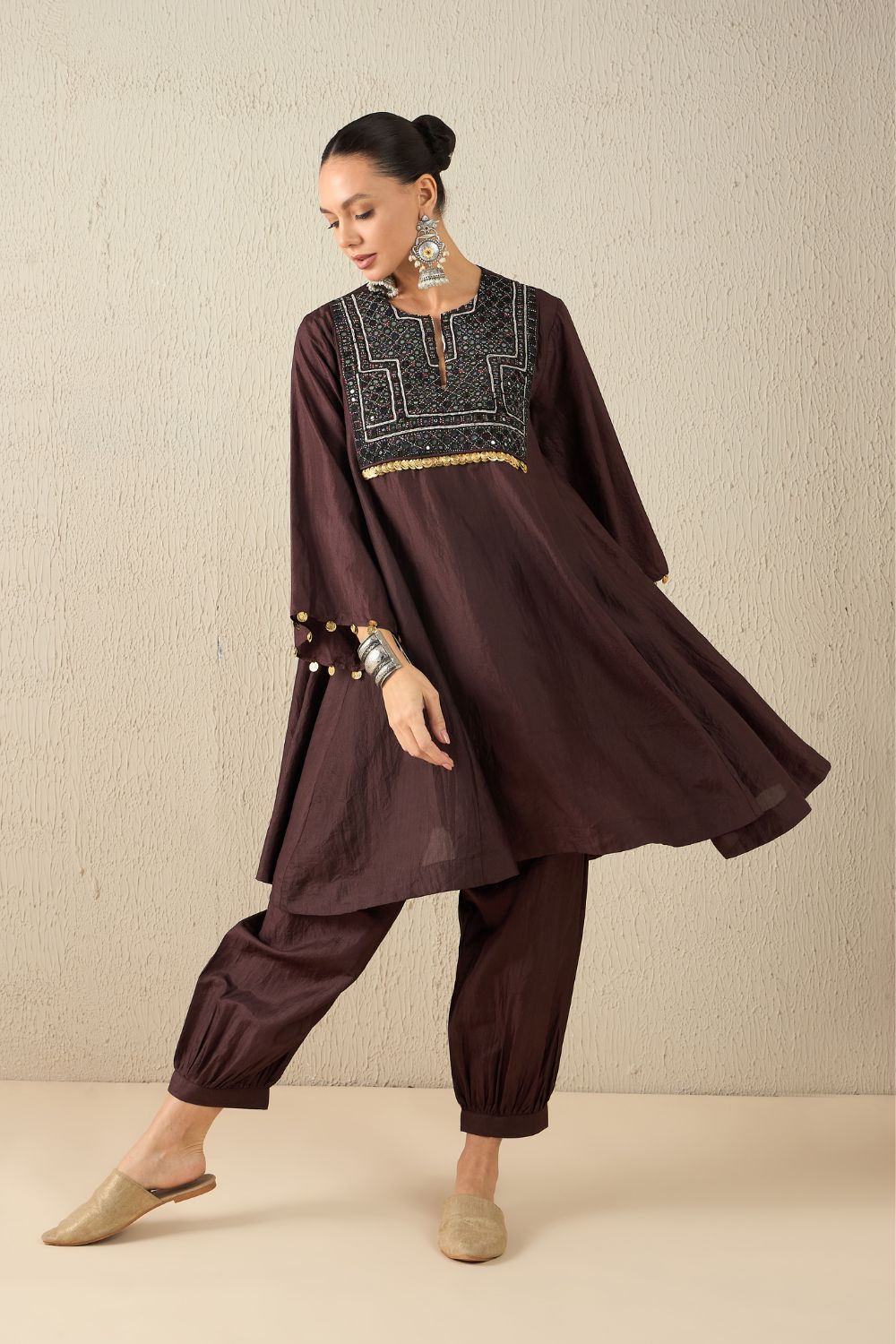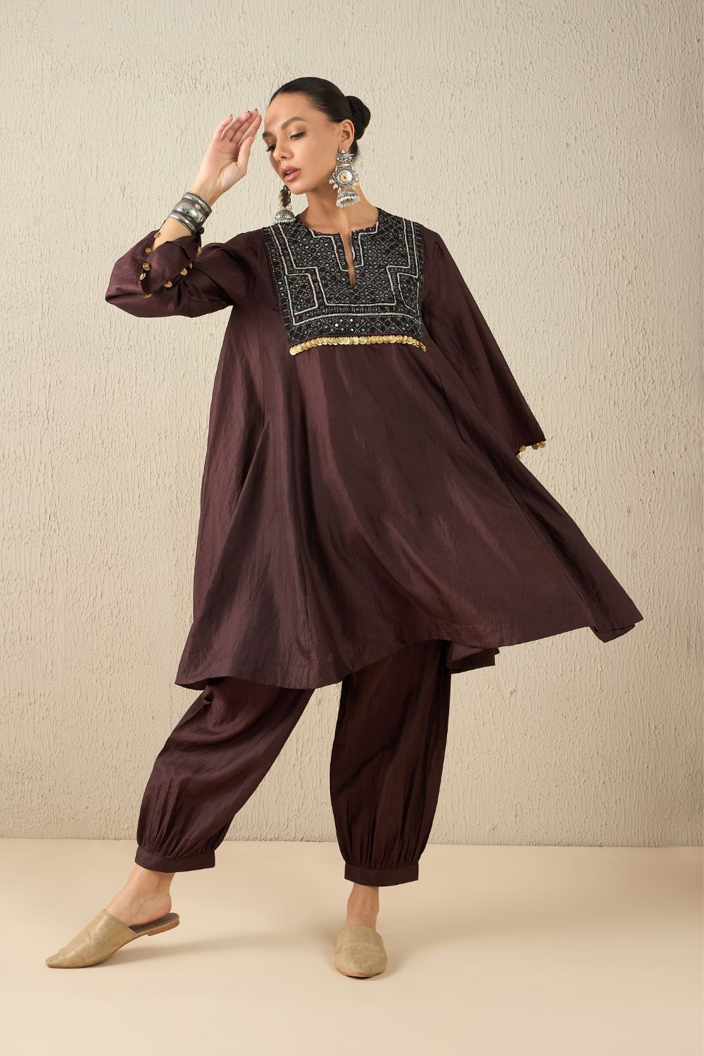 Kalidaar kurta with Harem pants crafted from the softest Bangalore silk. Each piece features beautifully hand-embroidered vintage mirror patches.