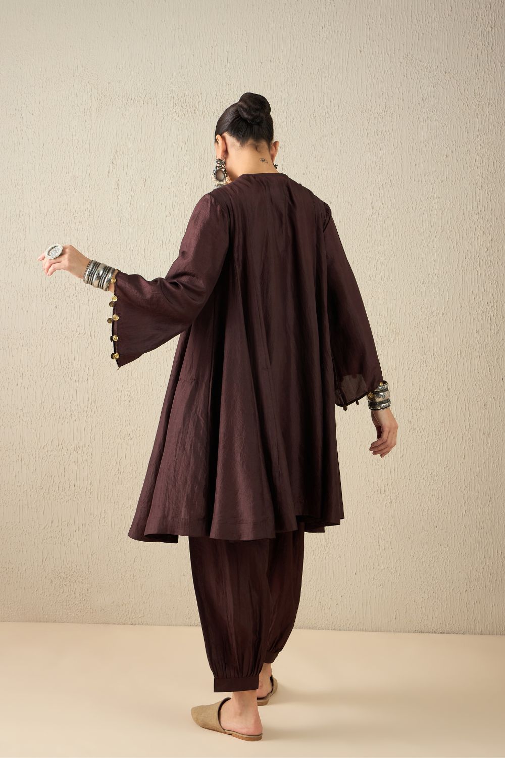 Aavidi’s language is one of soft architecture: silhouettes that breathe, fabrics that hold memory, and surface techniques — from clamp dyeing to block printing — that carry the imprint of time. Here, simplicity isn’t minimalism; it’s clarity. A grounding. A return.