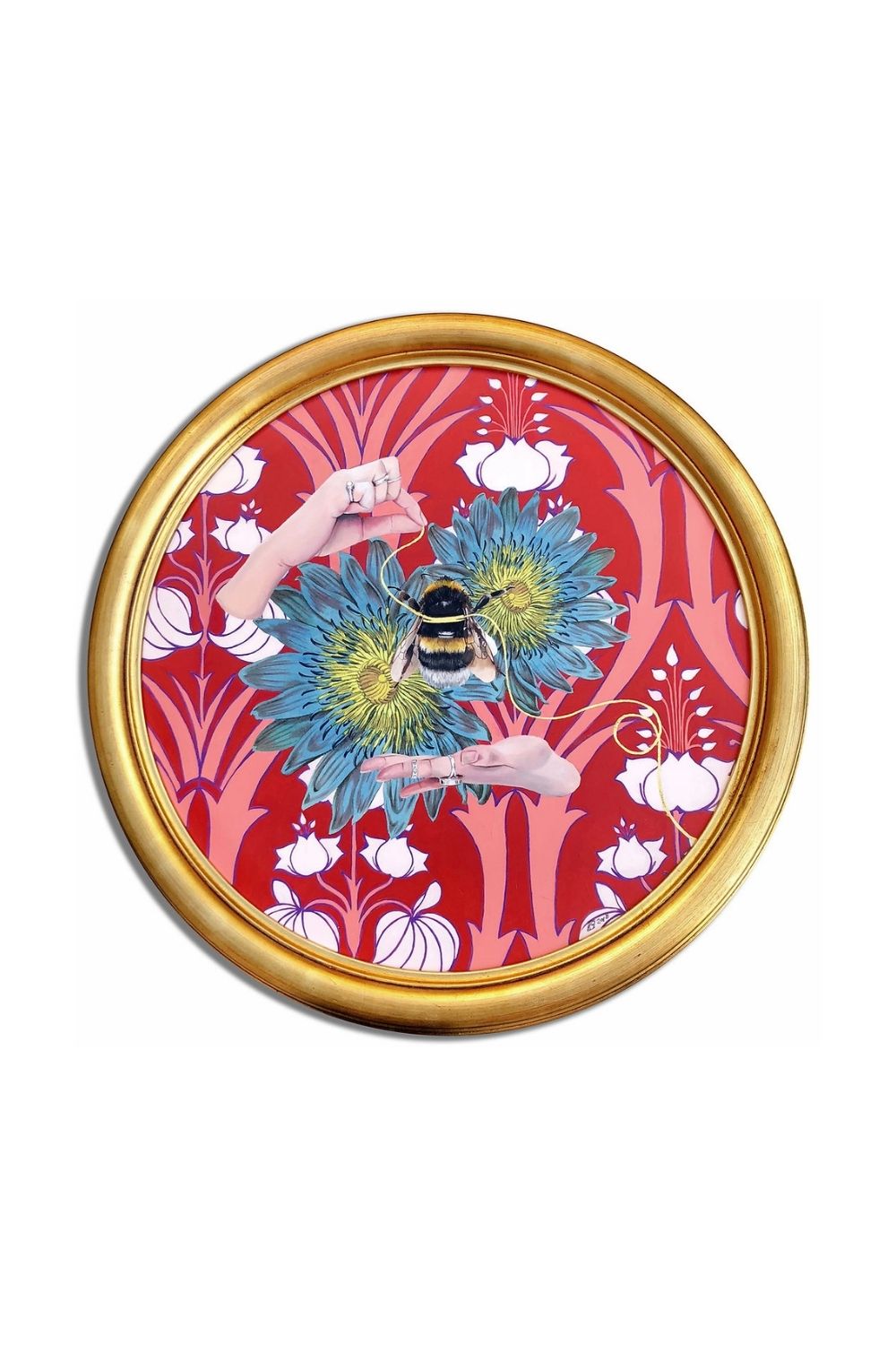 Mix of collage and oil paint, framed in a circular gold frame