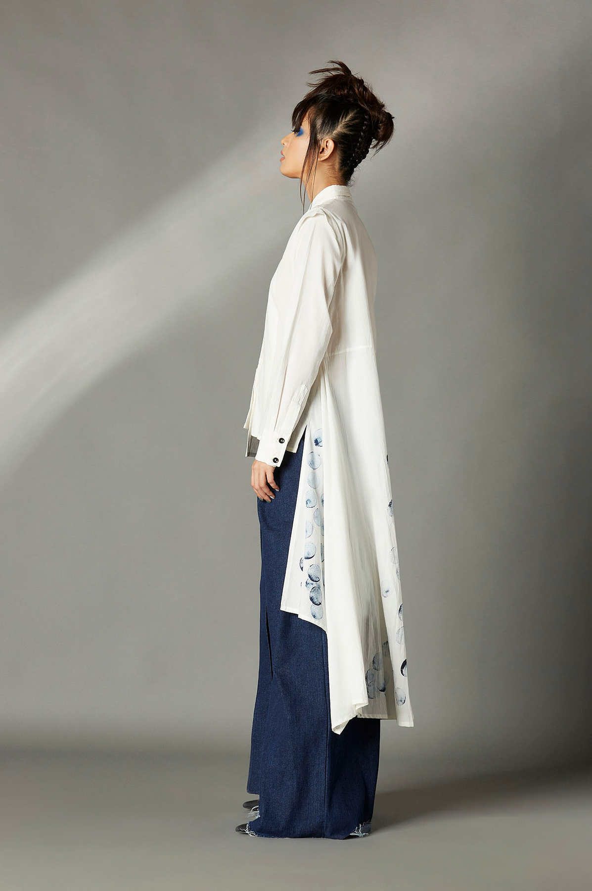 HAND PAINTED HIGH LOW PANEL SHIRT WITH NARROW FULL SLEEVES AND HALF BACK BUTTON DOWN PLACKET