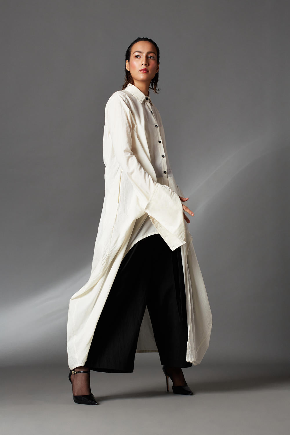 Chola’s universe begins with thoughtful materials. Recycled cottons, post-consumer fabrics, and free-cutting techniques come together in a kind of mindful choreography—one that honours form without creating waste, and prioritises movement over rigidity. This is clothing that feels lived-in yet architectural; pared-back yet quietly avant-garde.