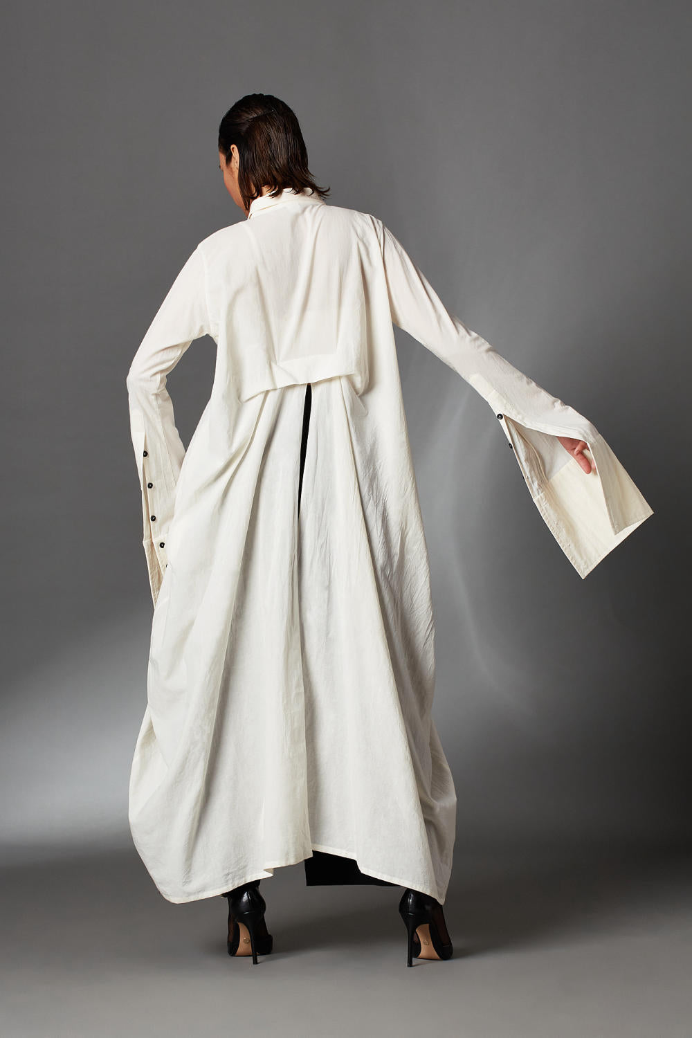 HIGH LOW SHIRT WITH REGULAR COLLAR, ELONGATED FULL SLEEVES WITH WIDE CUFF, HALD UNEVEN DOLD AND SLIT AT THE BACK