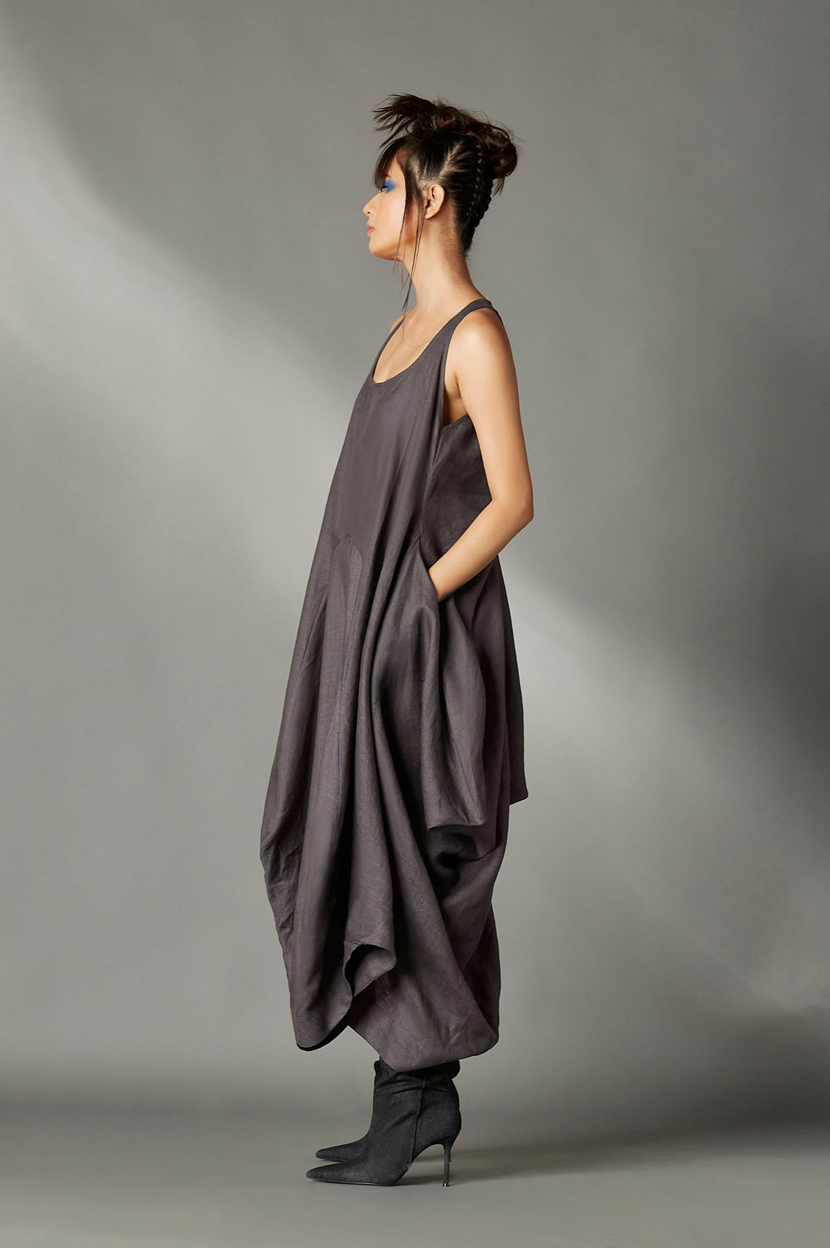 SLEEVELESS DECONSTRUCTED DRESS WITH SQUARE NECK, SIDE POCKETS AND UNEVEN HALF FOLD AT THE BACK