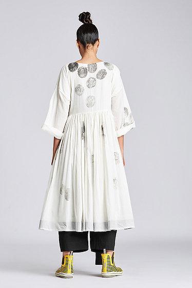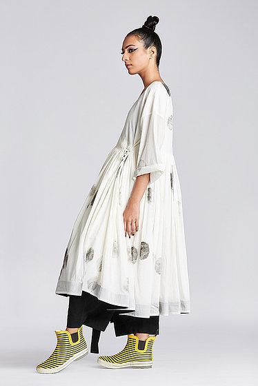 Hand painted drop shoulder frill angrakha dress with v neck, long sleeves and front tie up