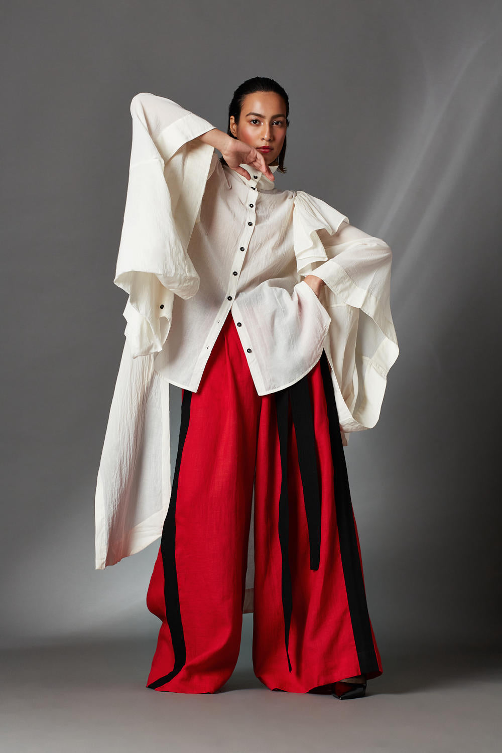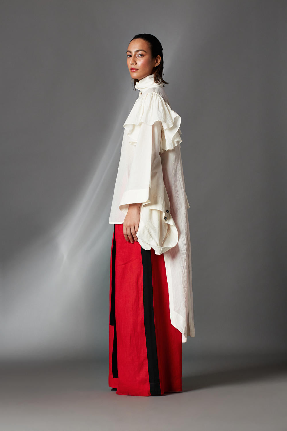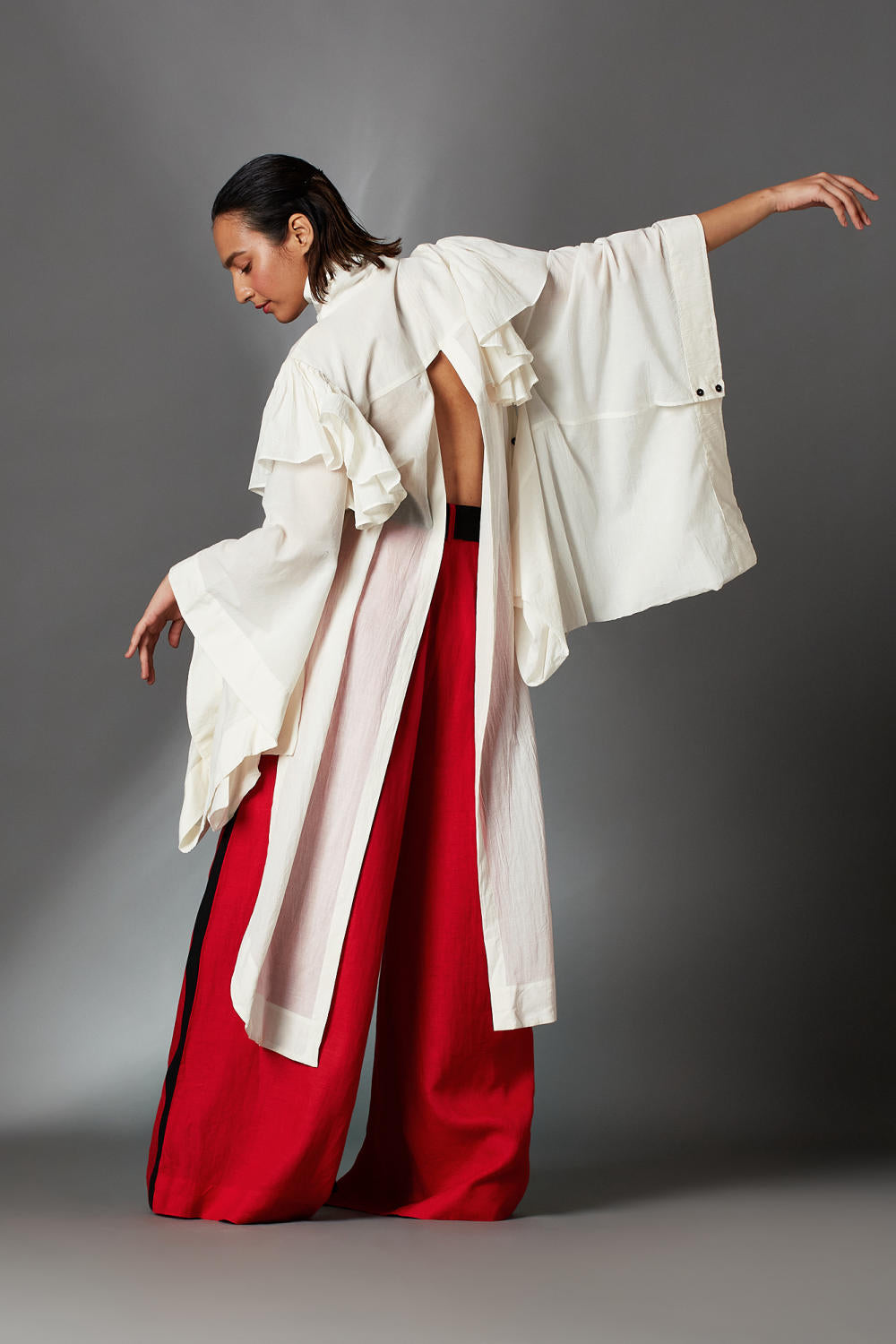 HIGH LOW SHIRT WITH REGULAR COLLAR, FRILLS AT THE ARMHOLE, DECONSTRUCTED SLEEVES AND SLIT AT THE BACK