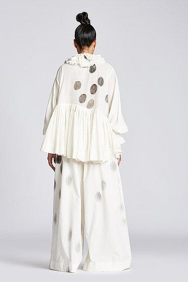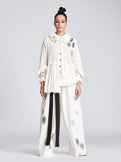 Hand painted drop shoulder shirt with frill collar, balloon sleeves and diagonal frill panel