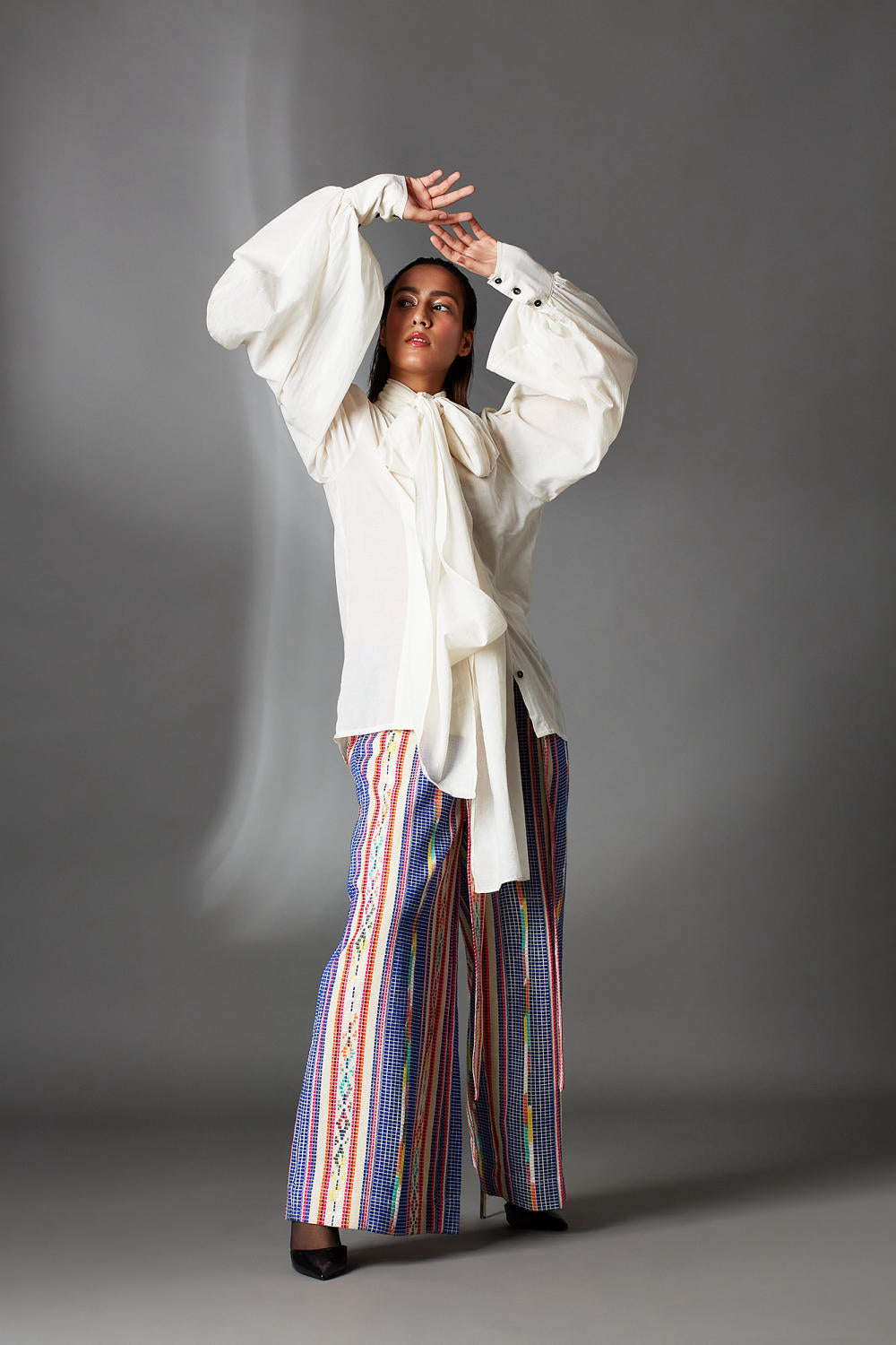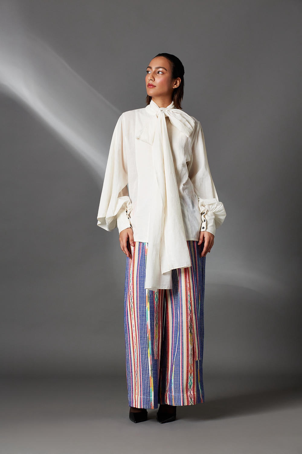 U SHAPE SHIRT WITH DETACHABLE SCARF COLLAR, YOKE, HALF BACK BUTTON DOWN PLACKET AND BALLOON SLEEVES