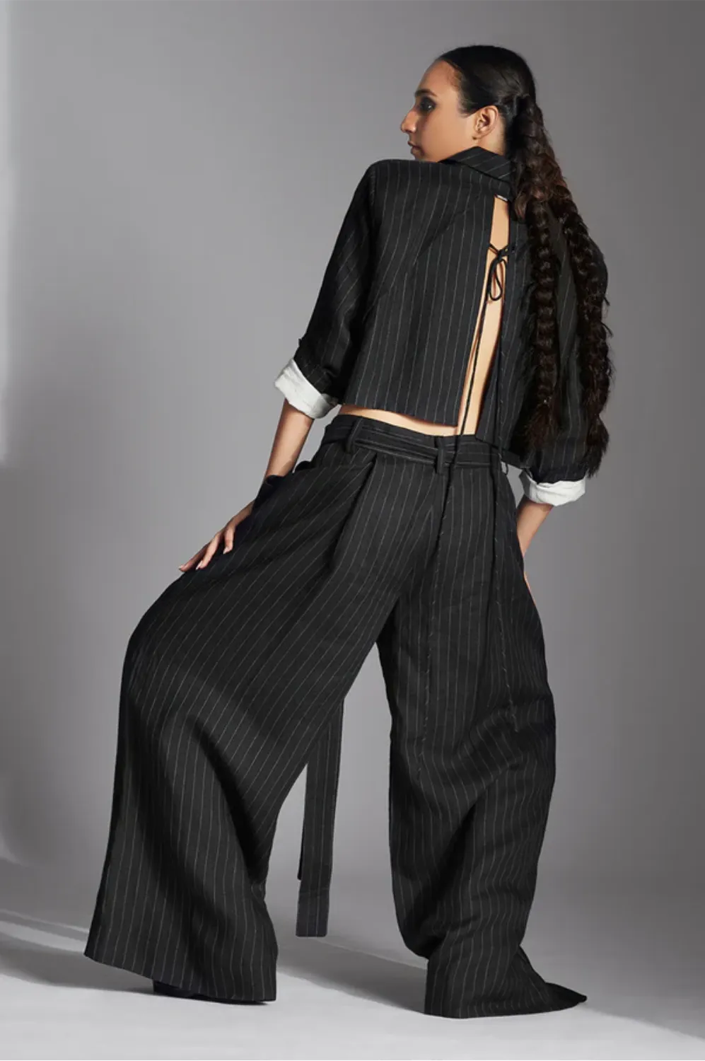 The Zyra jacket features a notched collar, full sleeves with a button and curved back flap with tie-ups.