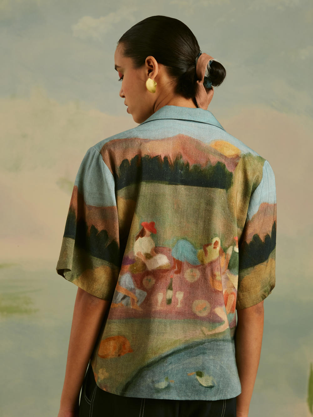 A classic style, promising comfort inspired by the retro era is the 60s shirt. With scenic escapades from nature, this shirt is made in a relaxed silhouette. With half sleeves and an overlap button panel, the shirt features wide open collars and a front opening with wooden buttons. The organic nature of the fabric being cotton assures breathability and falls light on the body naturally. The boxy silhouette can be tapered around the waist with a belt or a crossbody bag to accentuate the look.