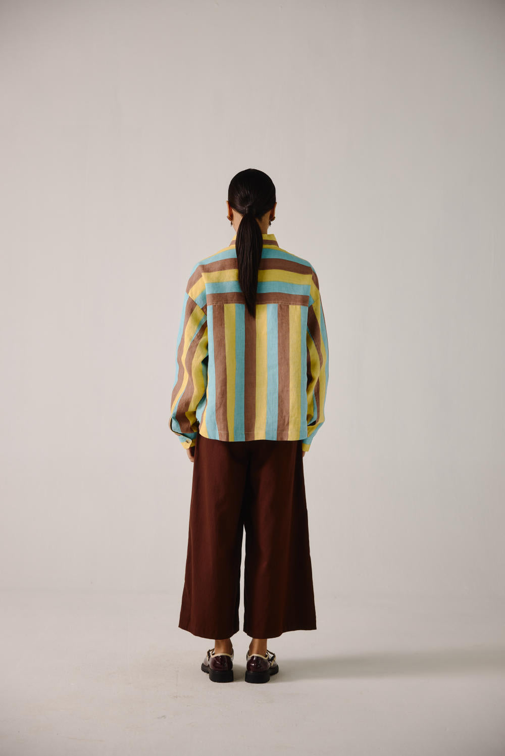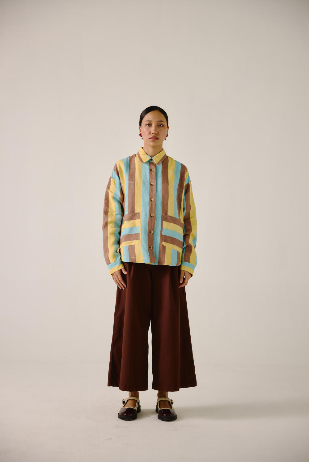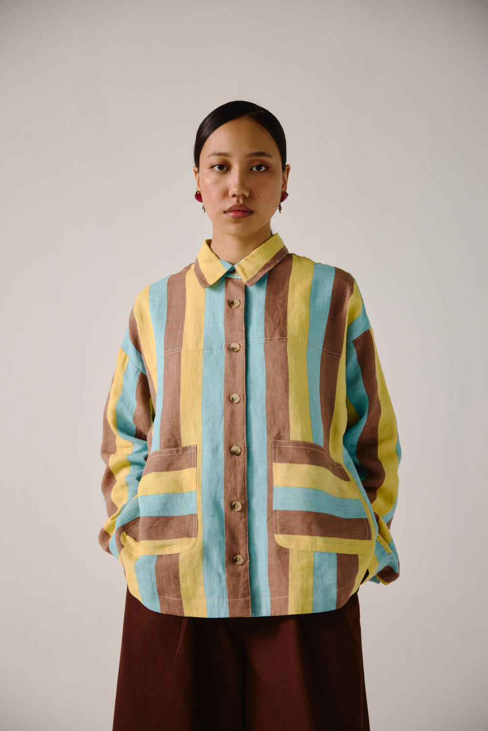 The Ava Jacket, crafted from breathable linen, is a versatile layering piece with a straight fit and a bold, vibrant Striper print. Designed for both style and functionality, it features full sleeves, practical pockets, and a curved hem for a refined finish. Effortlessly chic and easy to style, this jacket adds a striking touch to any outfit.