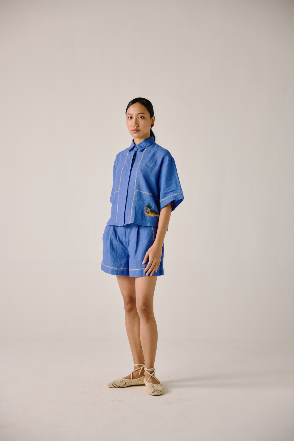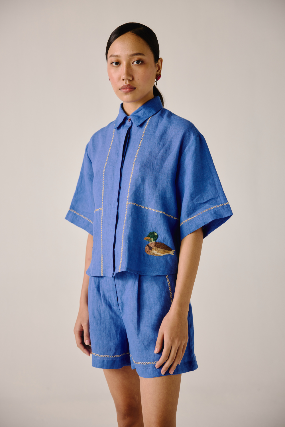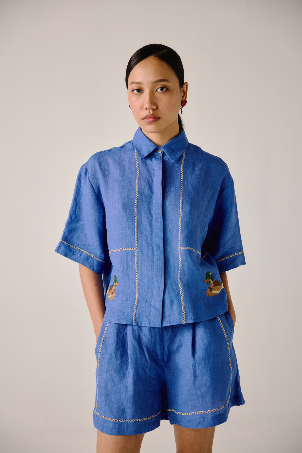 Crafted with meticulous attention to detail, this Ava shirt is sure to become your go-to choice this season. Embrace the charm of our Electric Blue Duck Emb. print. Each stitch tells a story, adding a touch of artisanal flair to your wardrobe.