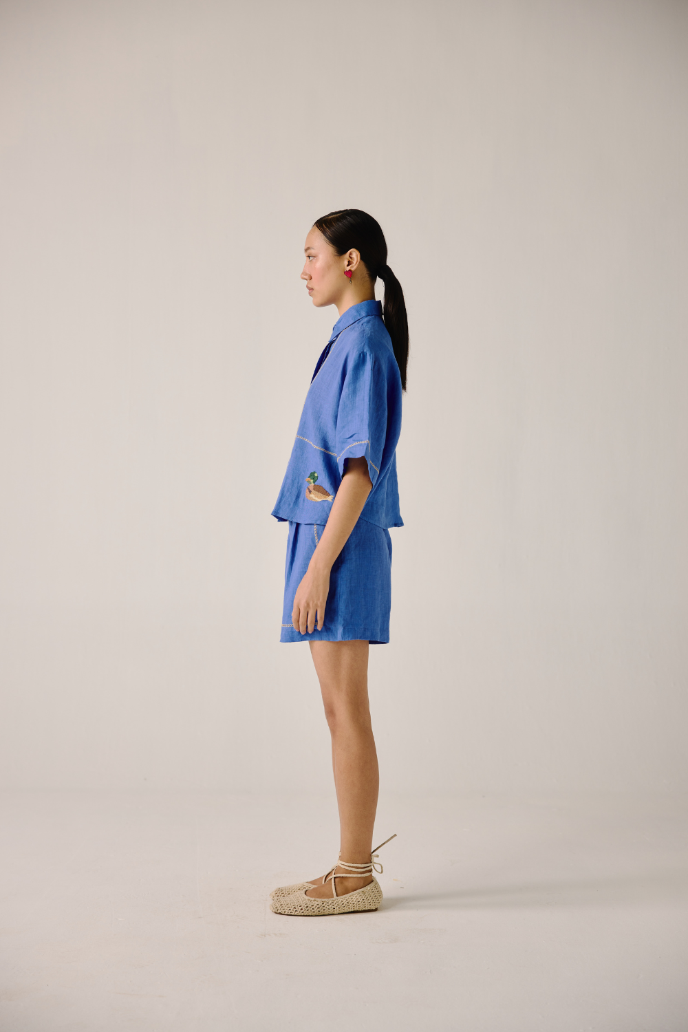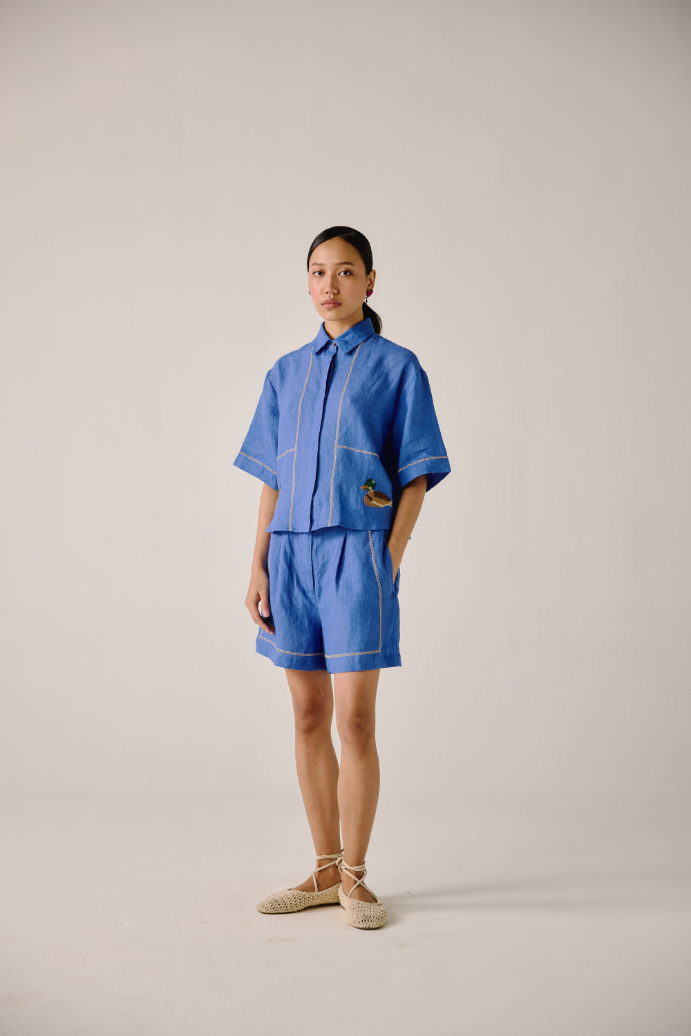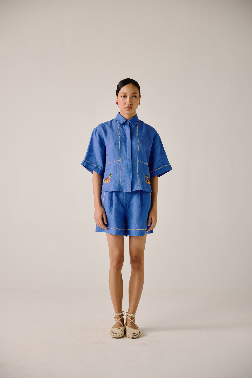 Crafted with meticulous attention to detail, this Ava shirt is sure to become your go-to choice this season. Embrace the charm of our Electric Blue Duck Emb. print. Each stitch tells a story, adding a touch of artisanal flair to your wardrobe.