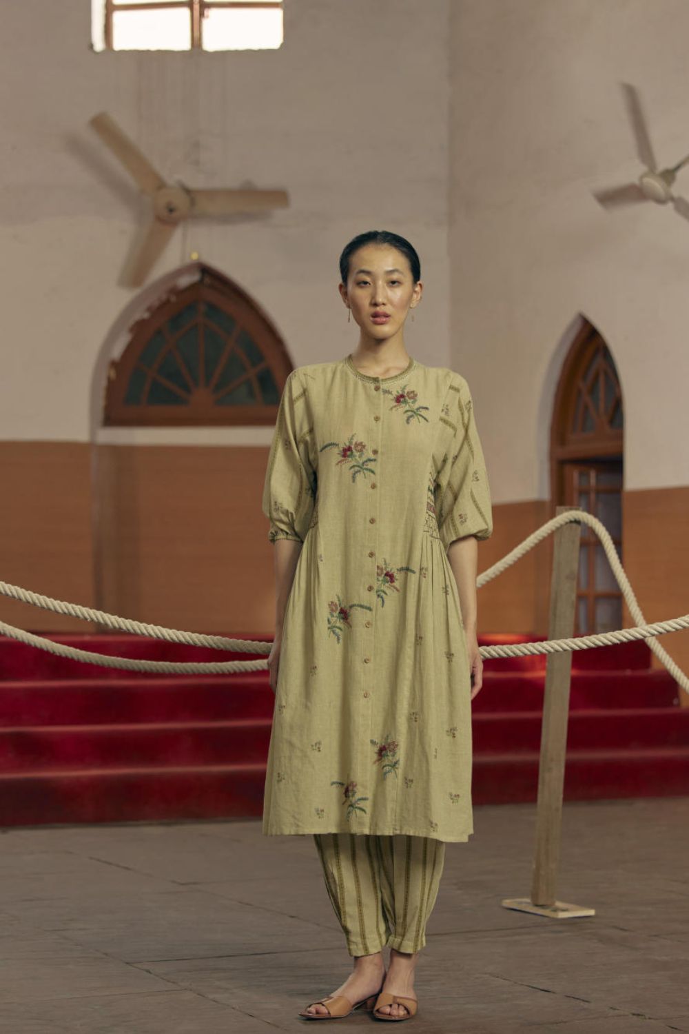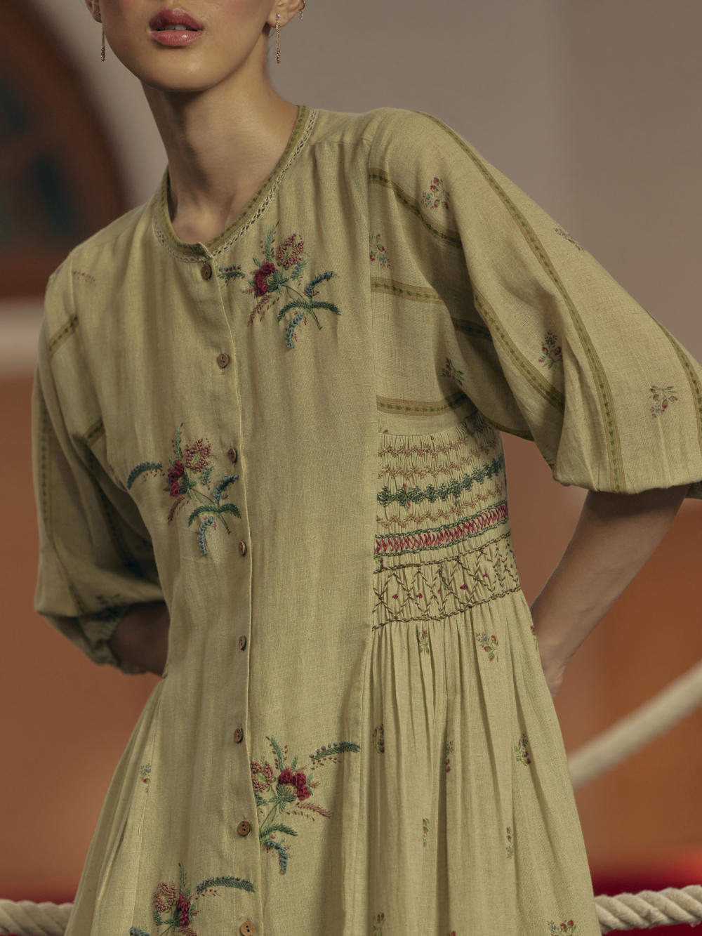 The Cascade dress is made from 100% pure cotton. It features coloured thread embroidery on the side panels and floral embroidery on the body of the garment with wooden button details.