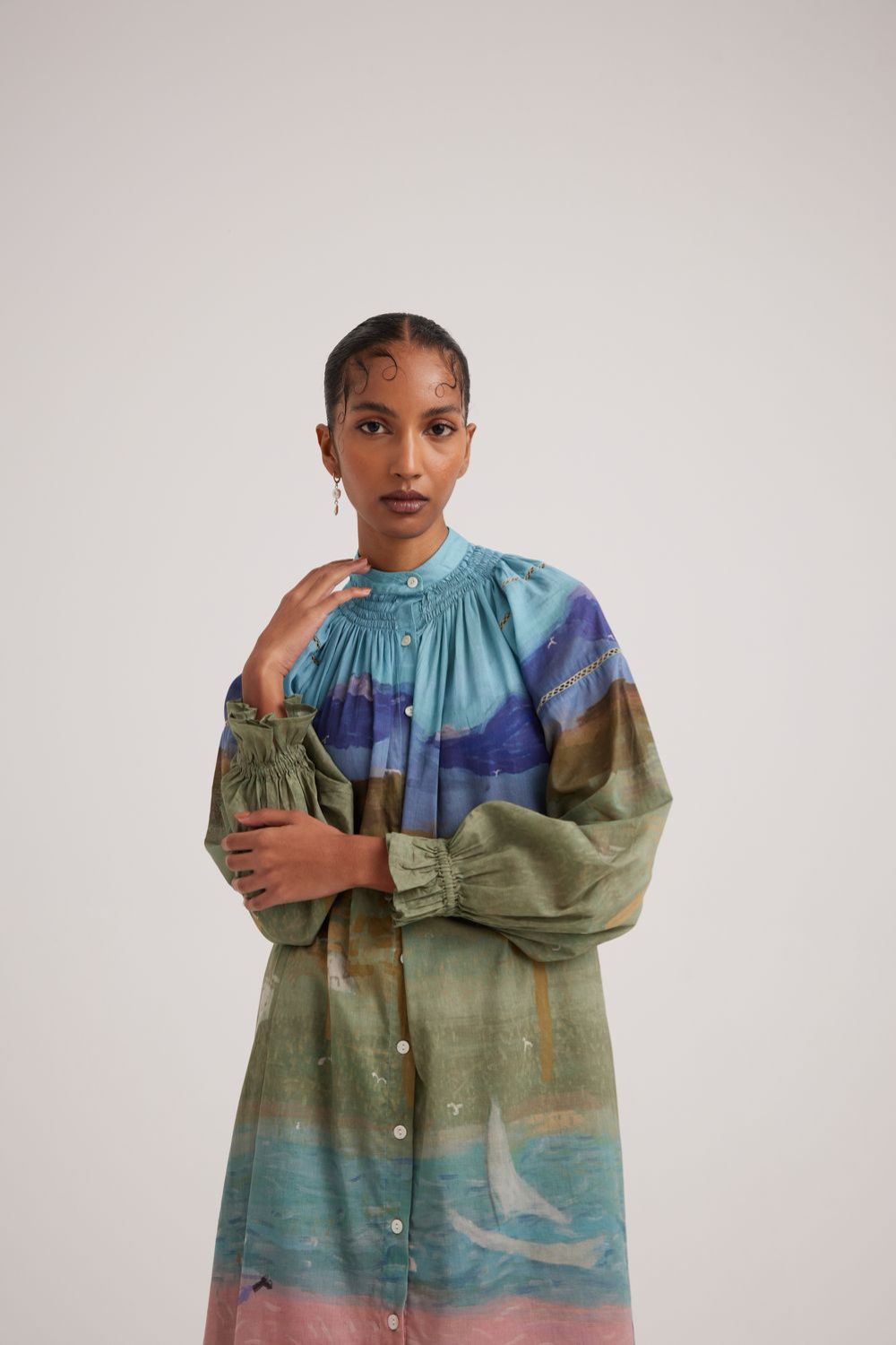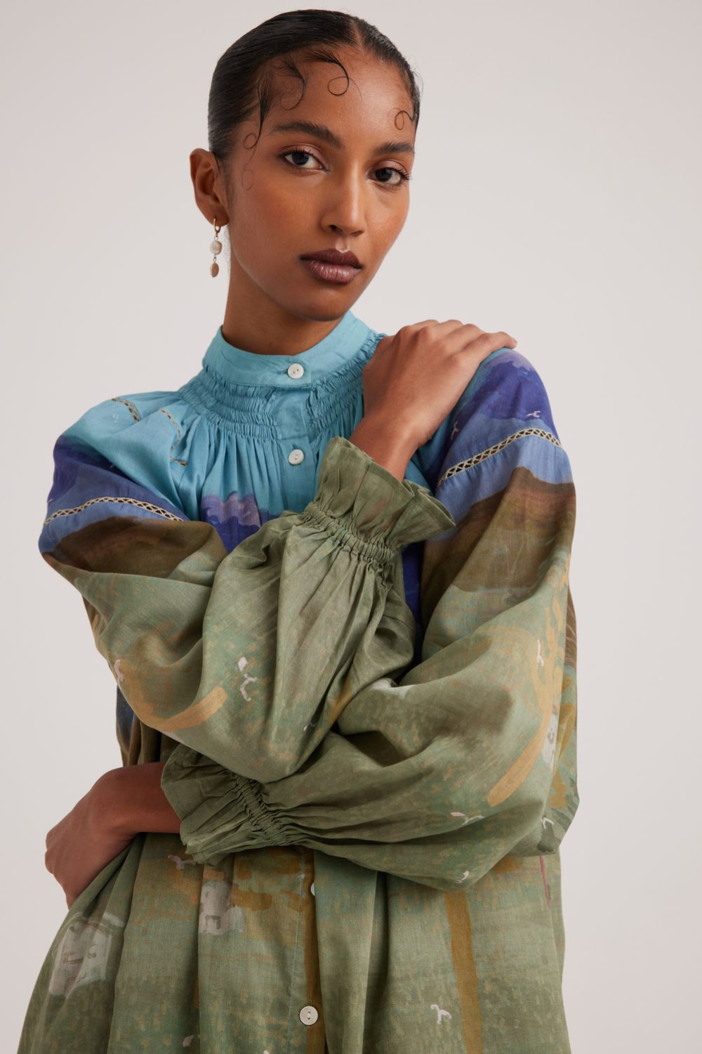 Details: Smocked neckline, front button fastening, shoulder lace inserts, puffed sleeves, drop shoulder