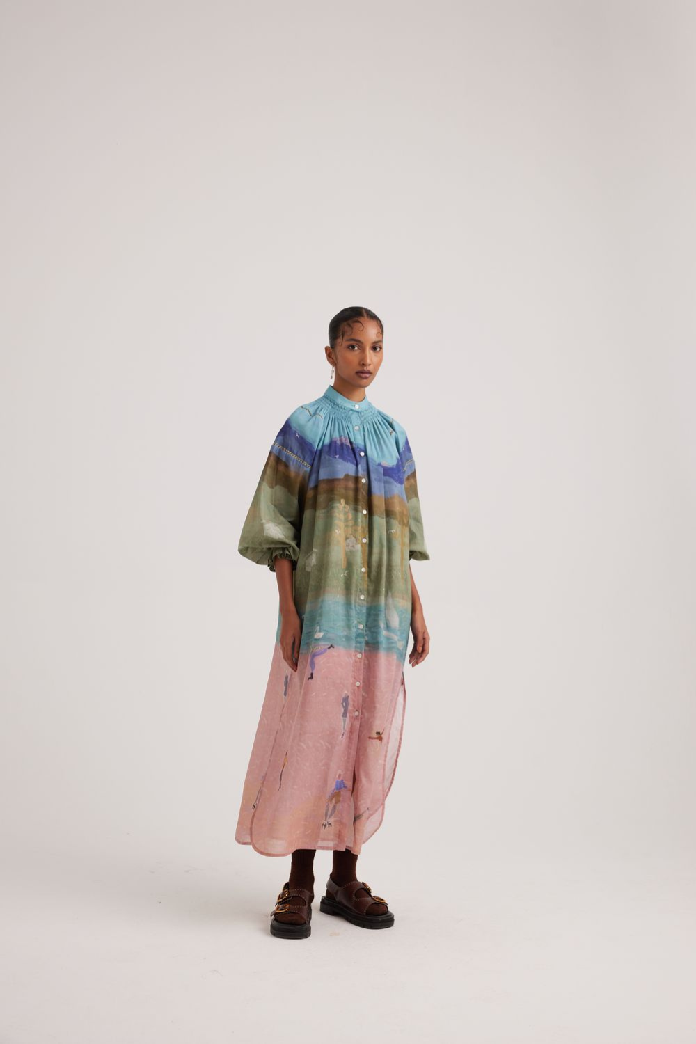 The Chloe dress is a buttoned-up dress with hand smocking on the neck, elasticated cuffs, and lace inserts on the shoulders. Designed in a flattering skater pattern, this dress effortlessly accentuates your silhouette, offering a comfortable and flattering fit. With an ankle-length hemline, it exudes an aura of effortless elegance.