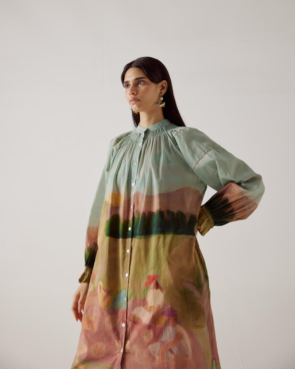 The Chloe dress is a buttoned-up dress with hand smocking on the neck elasticated cuffs and lace inserts on the shoulders. Designed in a flattering Spring pattern, this dress effortlessly accentuates your silhouette, offering a comfortable and flattering fit. With an ankle-length hemline, it exudes an aura of effortless elegance.
