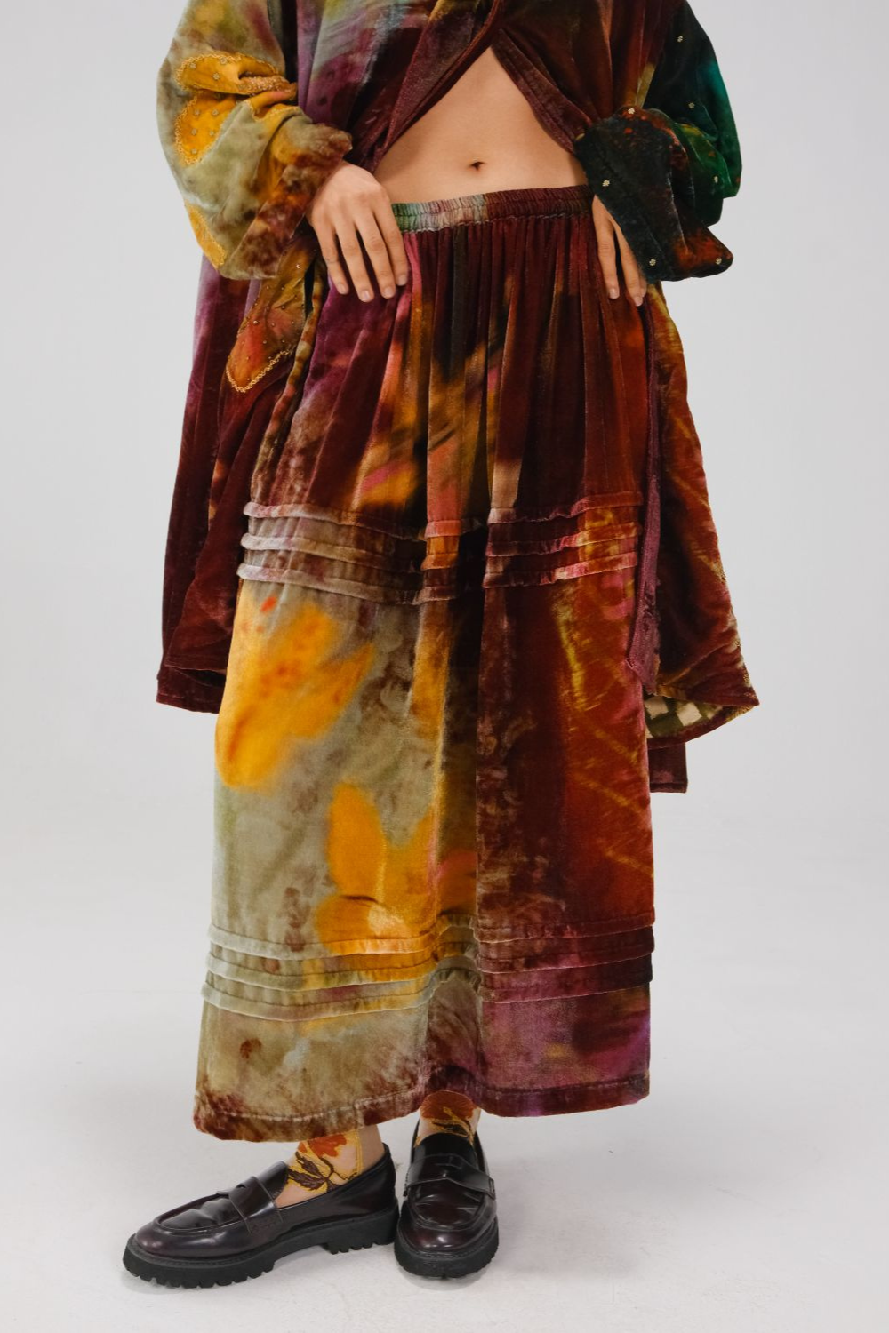 Our classic Emily skirt, now crafted in velvet fabric adorned with a charming print for a cozy, stylish feel of comfort and elegance.