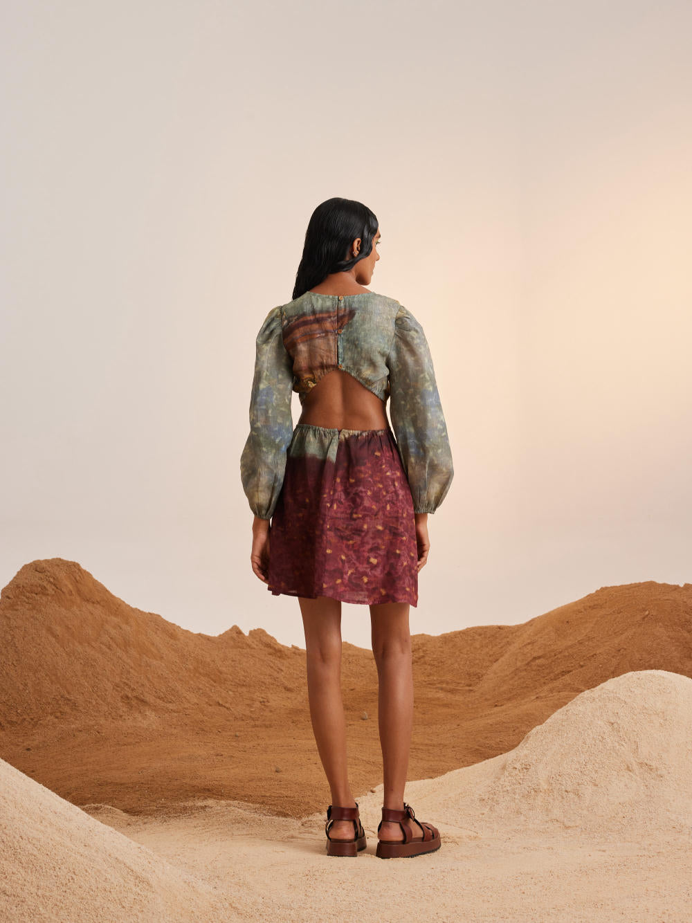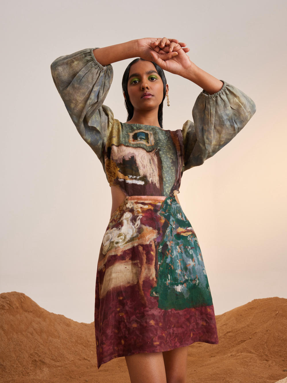 Where style meets comfort, the Euro dress is light on the body and picturesque on the outside. Fabricated in ethically sourced pure linen, the dress has a backless pattern with a flared skirt. It has voluminous sleeves that taper in the form of gathers along with the elasticated cuffs. The relaxed fit, mid-thigh length summer dress accentuates the body silhouette with cuts along the waist.