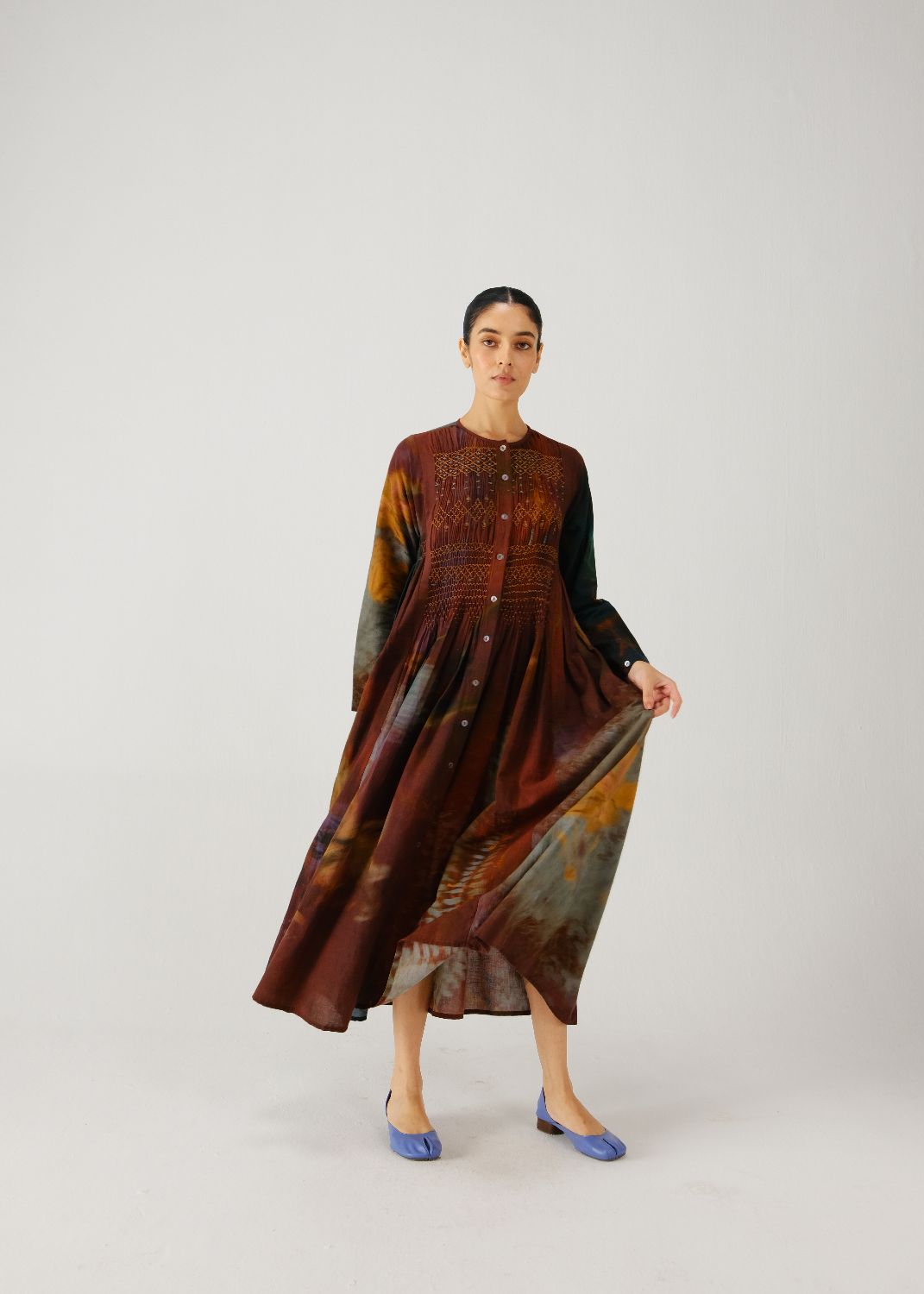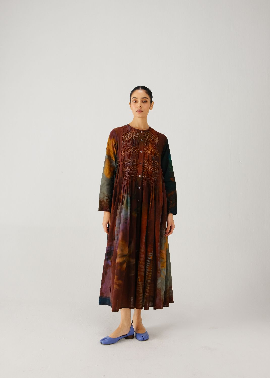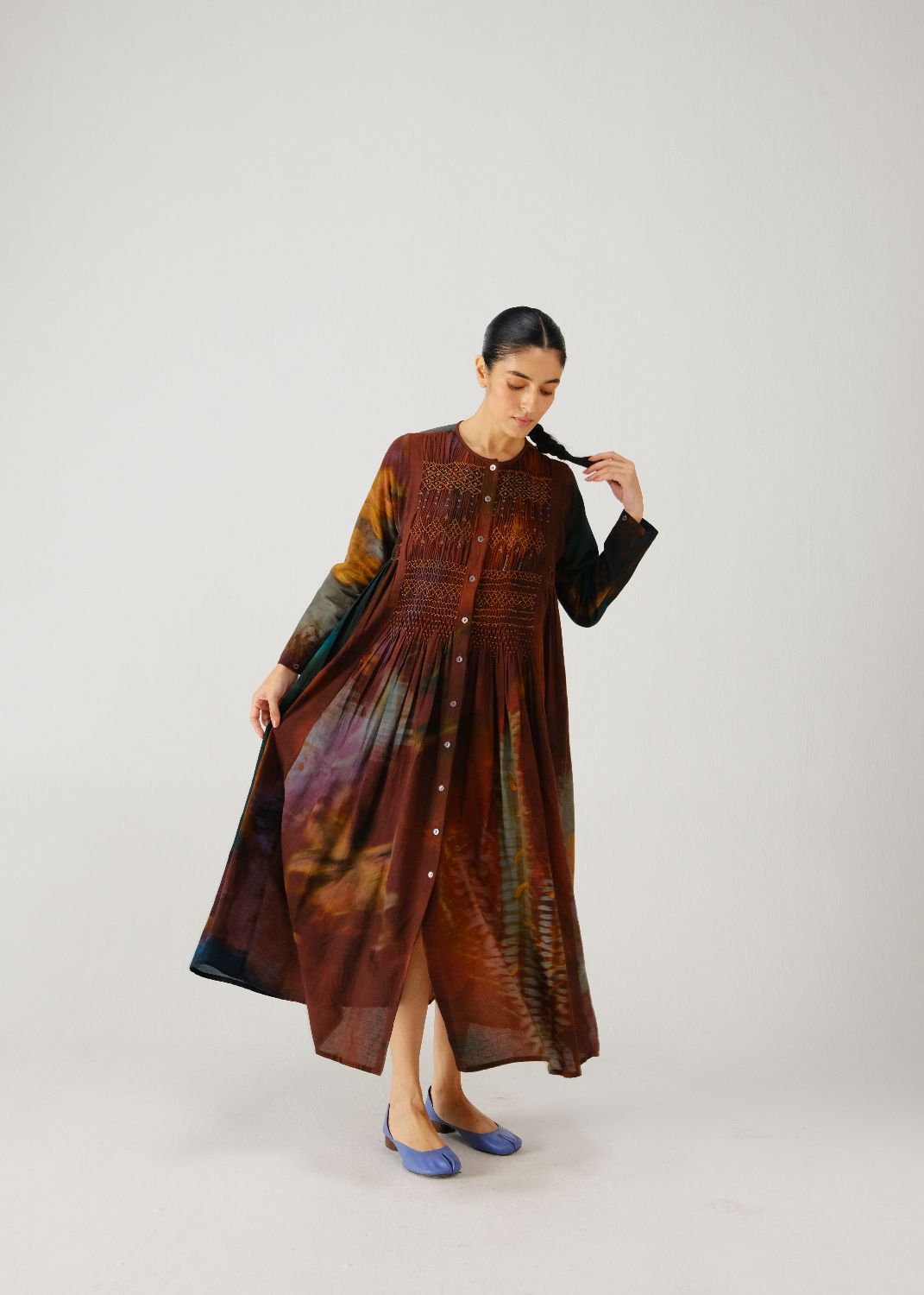 The Frida Dress is a relaxed silhouette made from pure cotton. The dress showcases a beautiful X-ray print on the body, full-length sleeves. Delicate smocking on the yoke and gentle gathers on the sides add subtle volume and texture, while buttons run along the front for easy fastening.