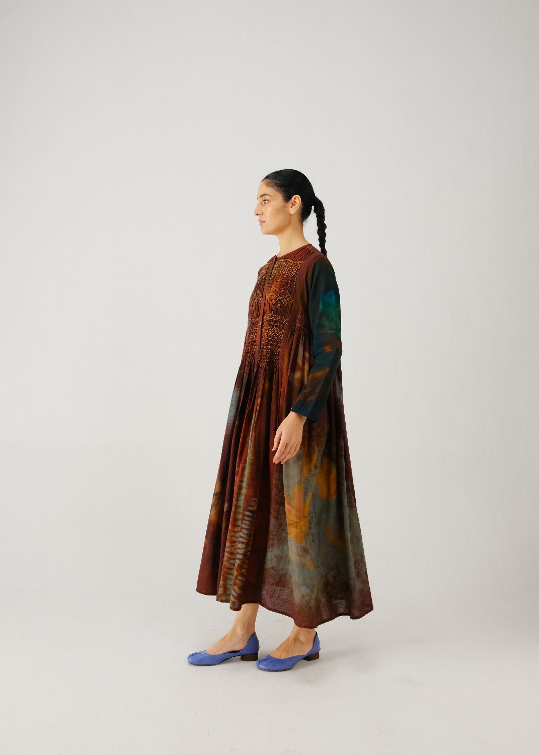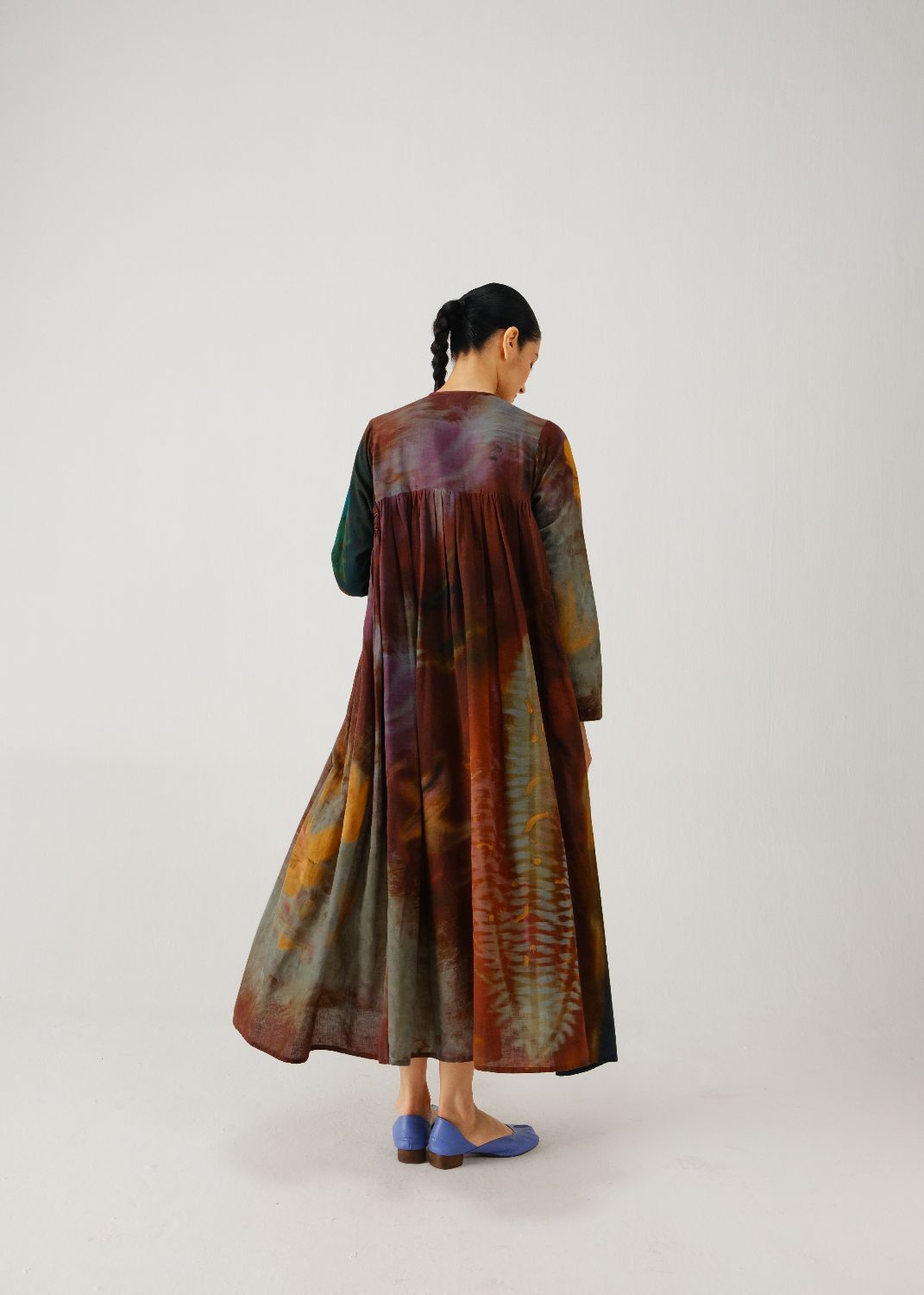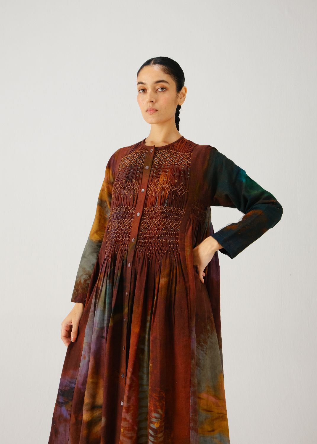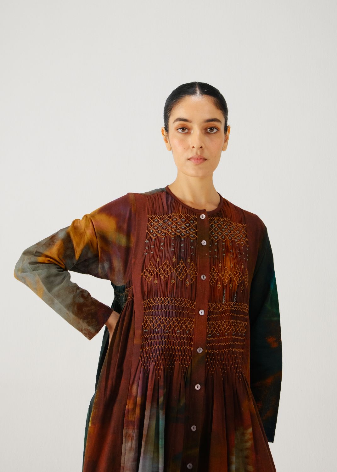 The Frida Dress is a relaxed silhouette made from pure cotton. The dress showcases a beautiful X-ray print on the body, full-length sleeves. Delicate smocking on the yoke and gentle gathers on the sides add subtle volume and texture, while buttons run along the front for easy fastening.