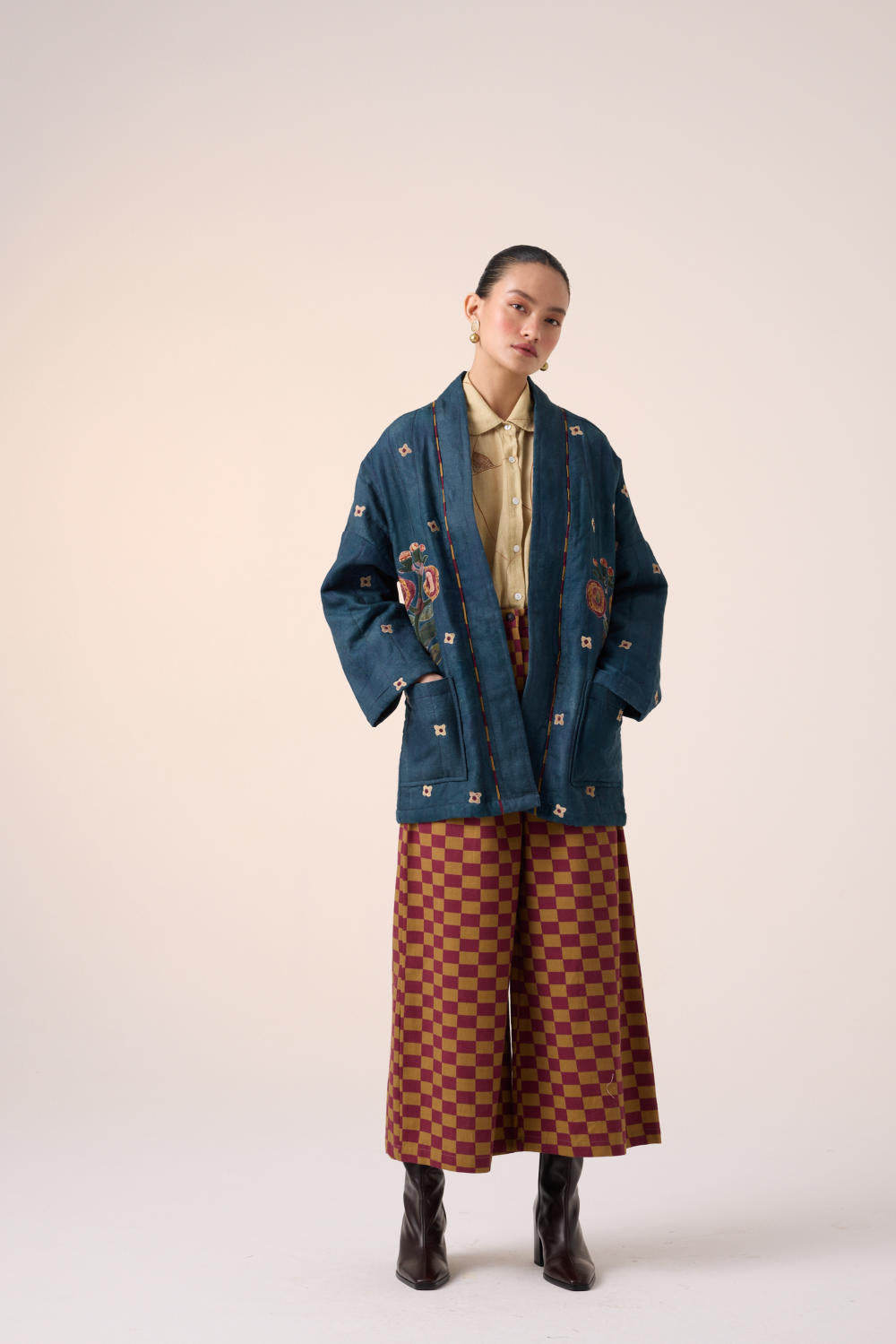 Embrace warmth and style with this snug quilted jacket in our signature dale print. The kimono-inspired silhouette and front tie-up details add a touch of sophistication. With patch pockets for functionality, this jacket combines comfort and style effortlessly. The unique watermark stitch pattern showcases precision & artistry.