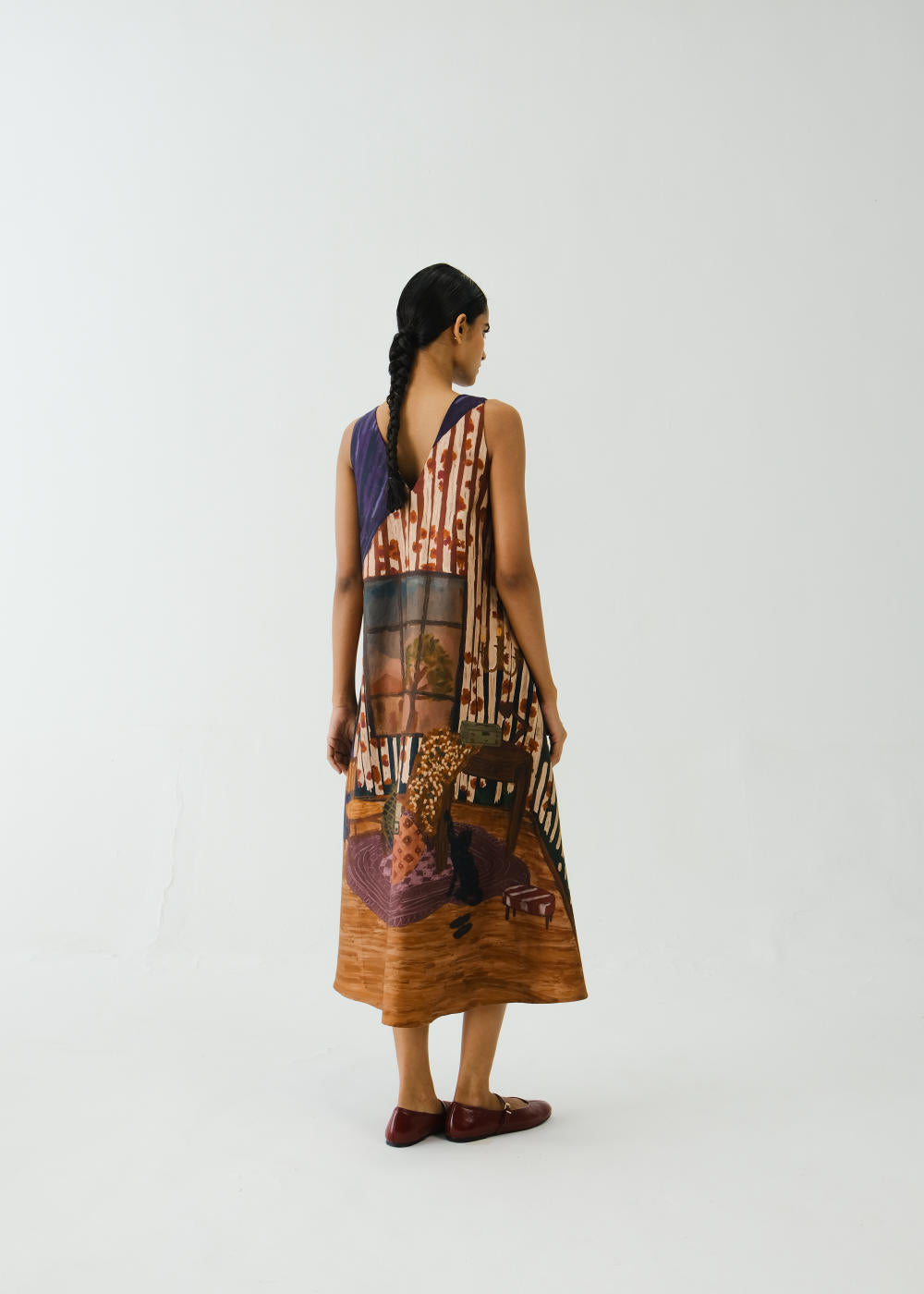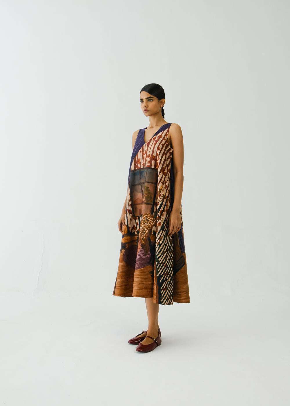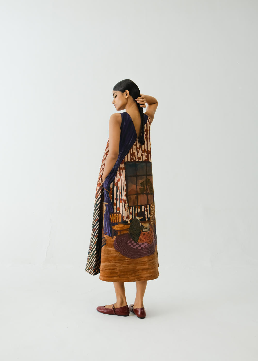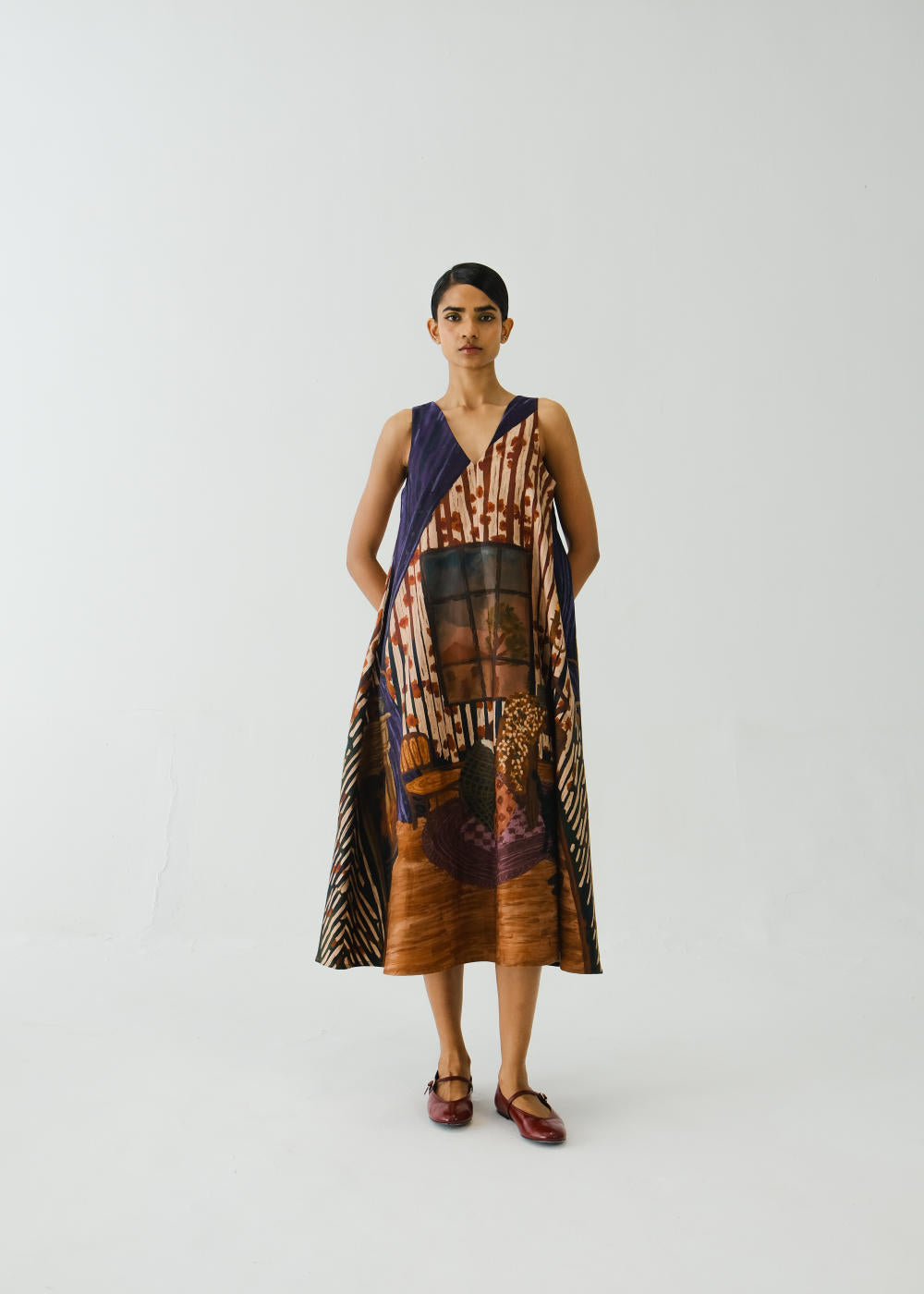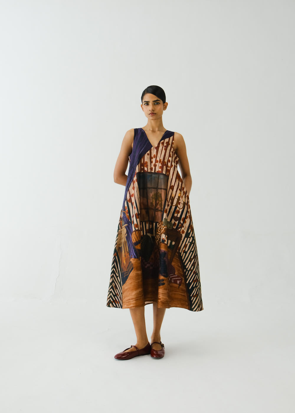 A perfect A-line dress with pockets in the side to give comfort yet an elegant look. Made with breathable cotton satin fabric in our Home Alone print. Fabric : Cotton Satin